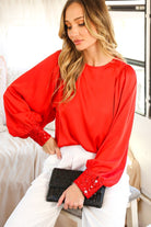 A luxe emerald satin blouse tailored with billowy long sleeves and sequin-embellished cuffs for a polished finish. The Emerald Satin Long Sleeve Blouse with Sequin Cuffs pairs easily with tailored trousers or a skirt for work or evening events. Lightweight, smooth fabric and a classic crew neckline create an elevated yet comfortable silhouette. Subtle shoulder gathers and the sparkling cuff detail give this blouse a refined, modern feel.