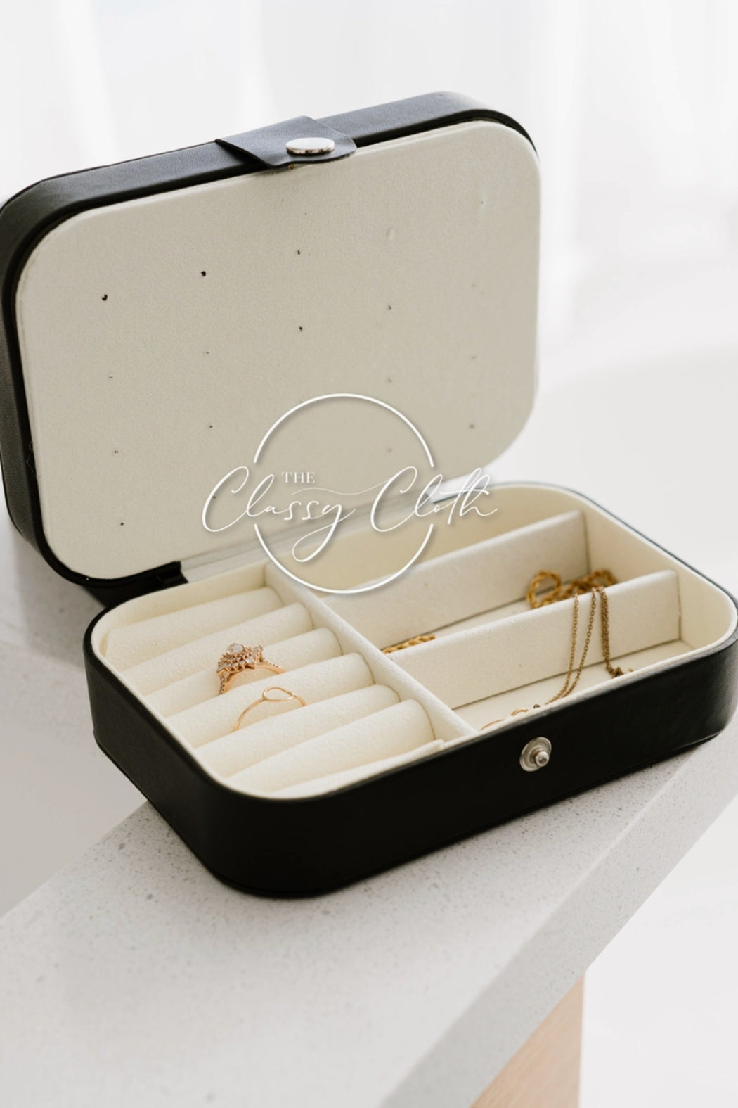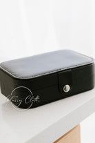 Adorn your favorite pieces of jewelry in style with this super cute Jewelry Case! The soft PU leather exterior and fabric interior provide a cozy home for your earrings, necklaces, and rings. It has post earring holders, hoop and necklace hooks, and ring compartments for optimal organizing, and a gold snap closure to keep all your treasures safe. Truly the perfect accessory for your accessories!