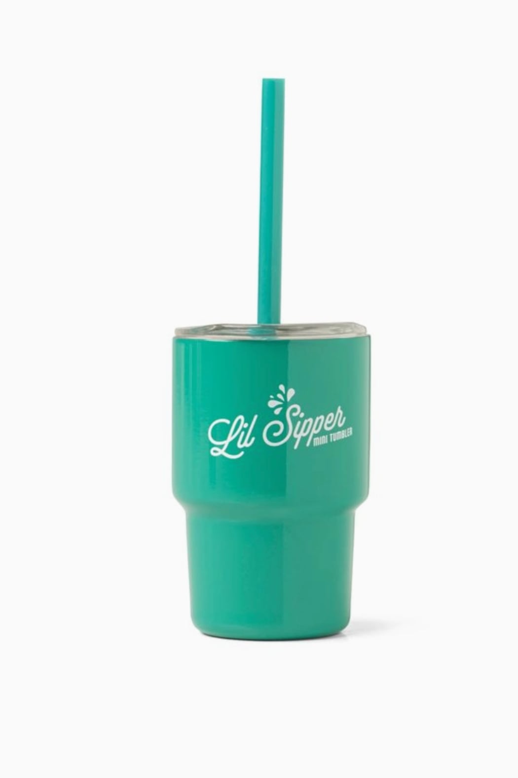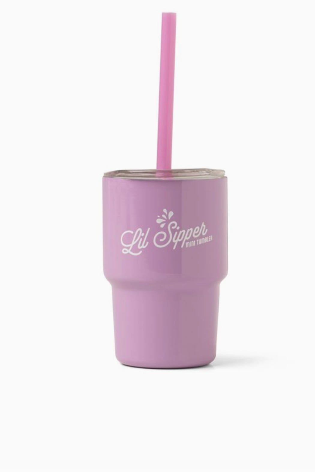 A compact pink mini tumbler with a clear lid and matching straw, perfect for small drinks on the go. The Lil' Sipper Mini Tumbler has a slim, double-tiered silhouette that fits most cup holders. DM Merchandising designed this cheerful drink cup for everyday use and easy sipping. Its glossy finish and printed logo give it a playful, giftable look.
