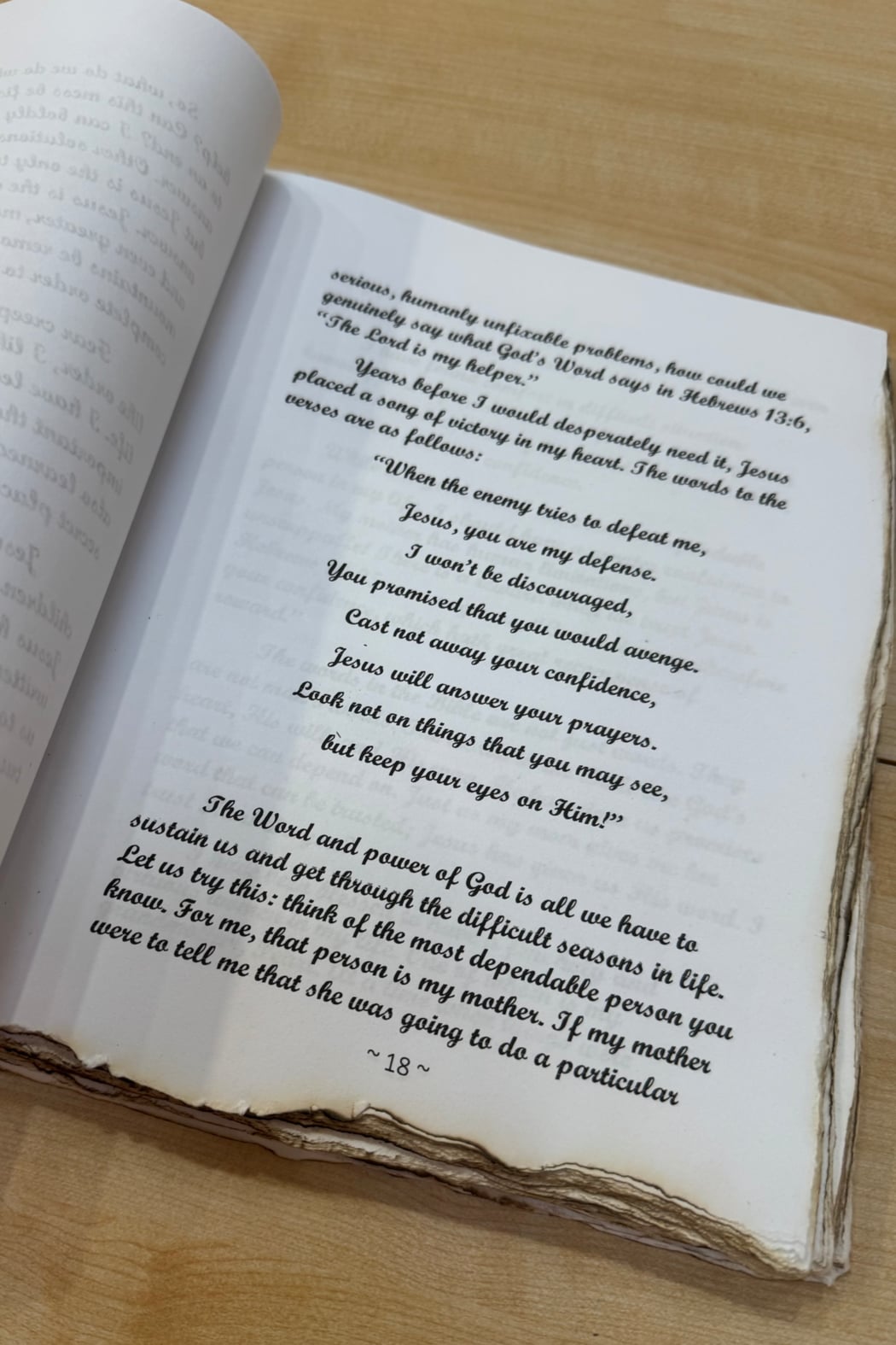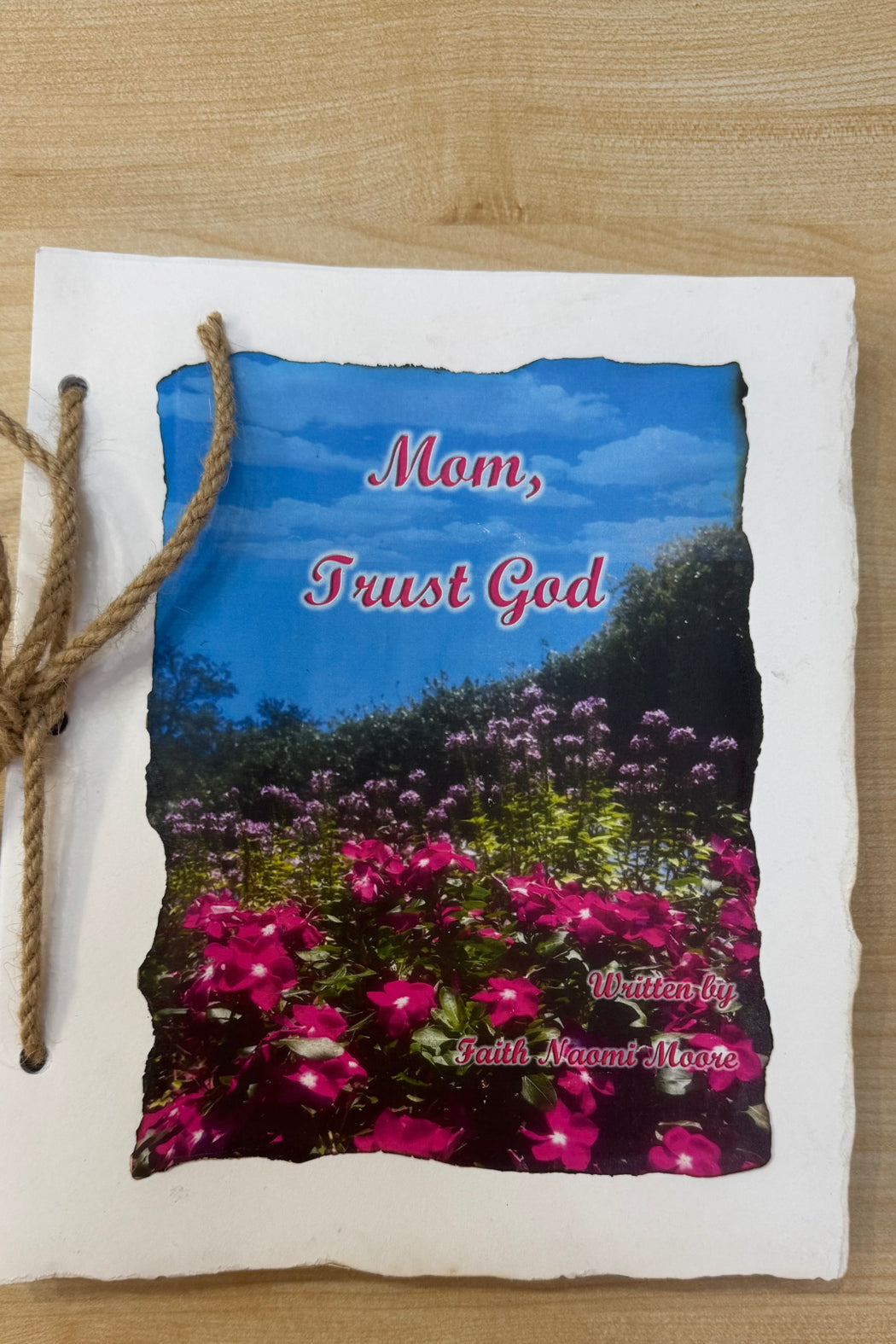 Local Author Faith Naomi Moore’s hand binded book. A small, rope-bound devotional titled “Mom, Trust God” with a floral photographic cover and textured cardstock pages. The book offers short, inspirational messages and reflections meant for mothers seeking faith-centered encouragement. It’s presented like a keepsake gift with a natural twine binding and handcrafted feel. Perfect as a simple, thoughtful present for Mother’s Day or any occasion to uplift a mom.