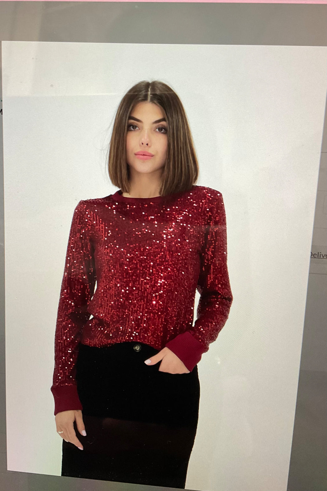 Shimmering and bold, the Nessa Sequin Top brings party-ready polish to your wardrobe. This long-sleeve crew-neck top is covered in ruby sequins for all-over sparkle and has ribbed cuffs for a comfortable fit. Style it with a sleek skirt or tailored pants for evening looks from Another Love.