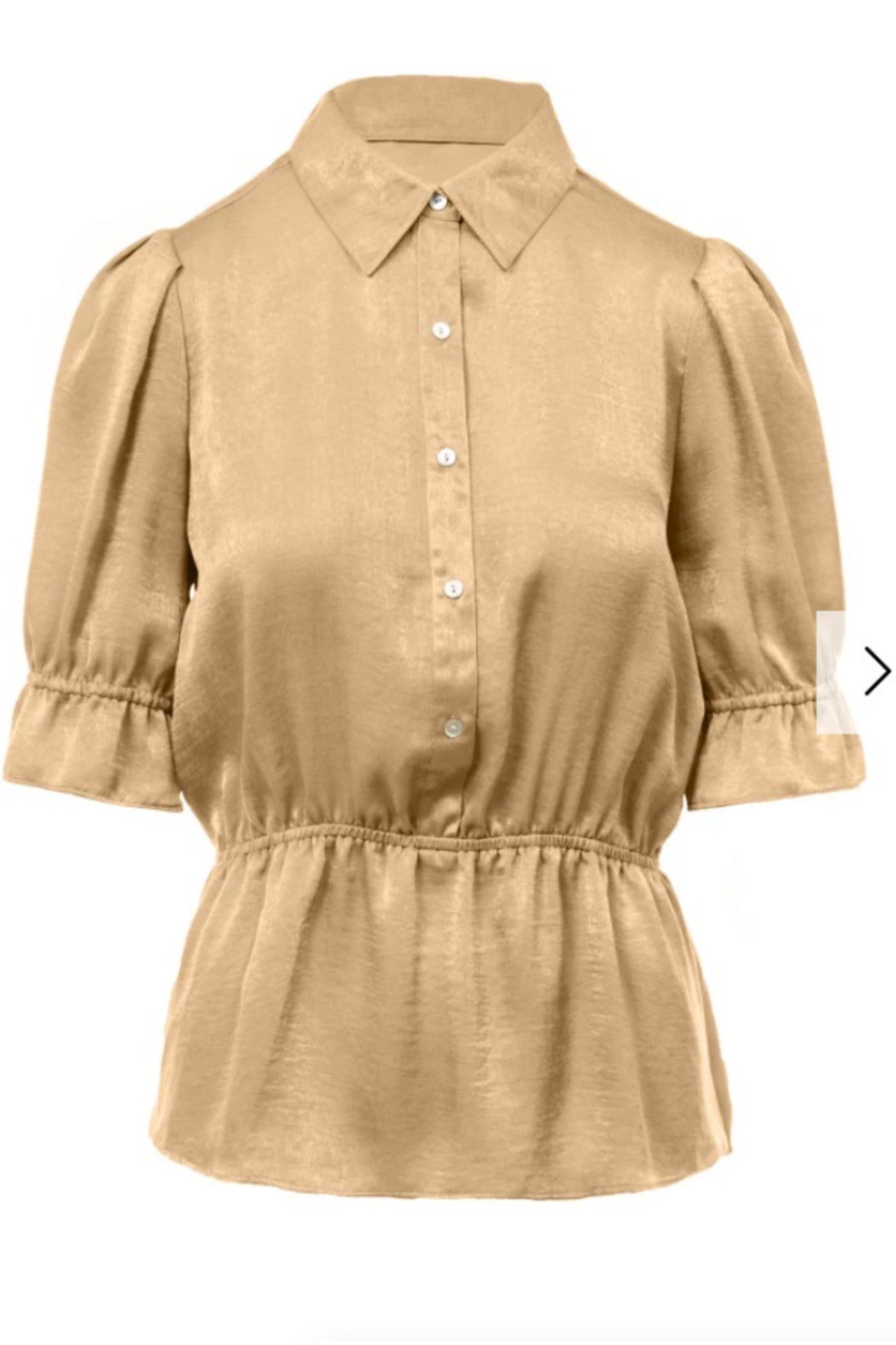 The Placket Blouse is a tailored button-front top with a classic shirt collar and a softly gathered peplum waist. Naked Zebra designed this blouse in a lightweight, slightly lustrous fabric with short puff sleeves and elasticized cuff detailing for a polished, feminine silhouette. Style it for the office or dress it down for weekend outings.