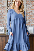 This V-Neck Long Sleeve Tiered Dress is an airy, relaxed silhouette with a gathered empire seam and ruffled hem for movement. The dress features long sleeves, a V-neckline and side pockets for easy everyday wear. Its lightweight woven drape and tiered skirt give a boho-meets-casual feel that works for weekend outings or brunch. Heimish designed it with effortless styling in mind for easy layering or sandals.