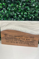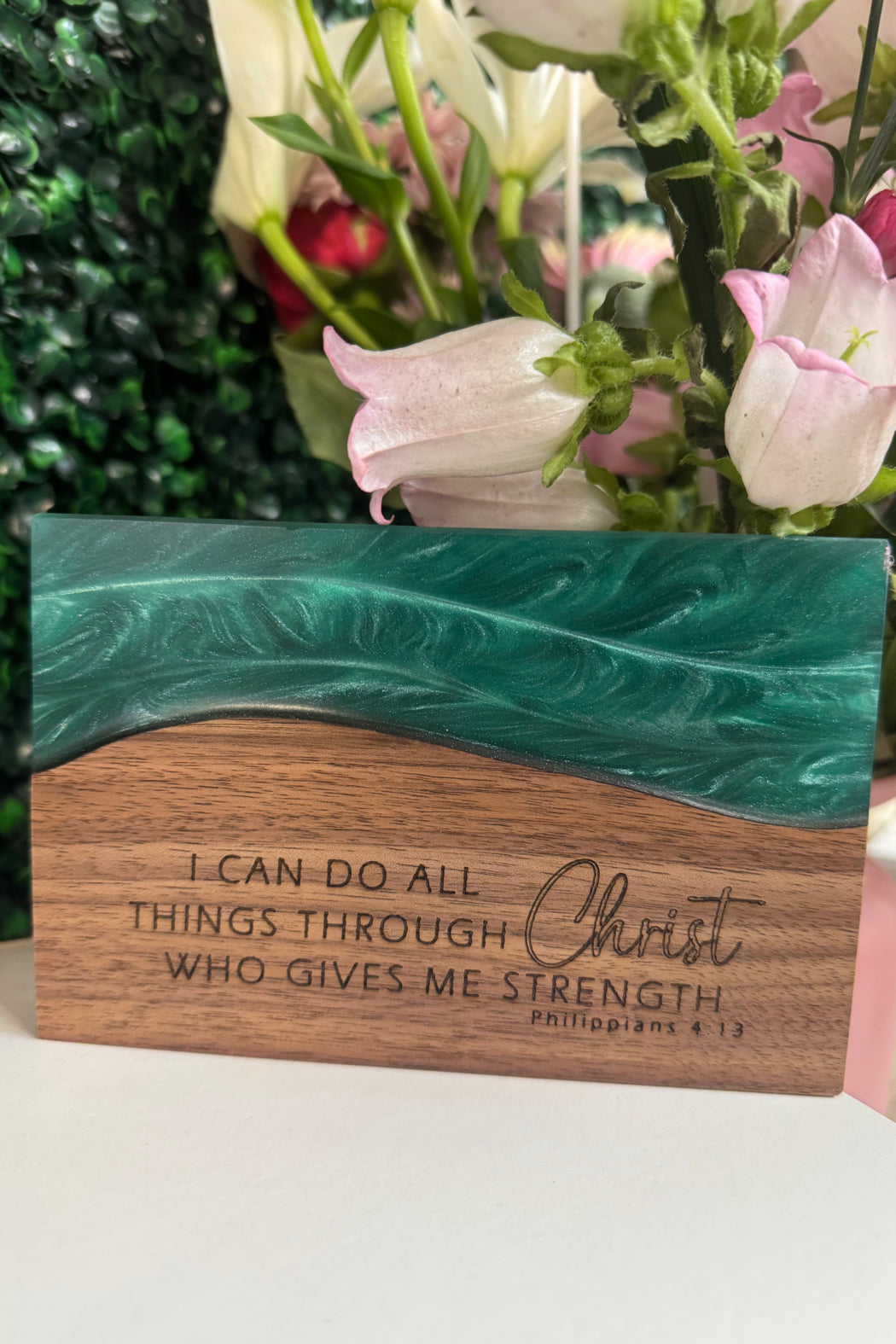 Locally Handcrafted 4 in X 6 in solid walnut blocks fused with epoxy resin Laser engraved with Bible verses or inspirational quotes Perfect for friends, co-workers, teachers or that special someone in your life.
