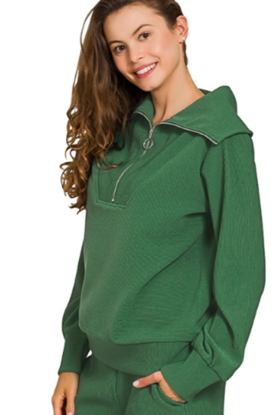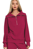 The Zenana Half-Zip Sweatshirt is a relaxed pullover with a stand-style zip collar and ribbed cuffs and hem for an easy, modern look. This sweatshirt from Zenana features a subtle textured knit and a silver O-ring zipper that elevates a cozy silhouette. Wear it as casual everyday outerwear or lounge-at-home layering when you want comfort with style.