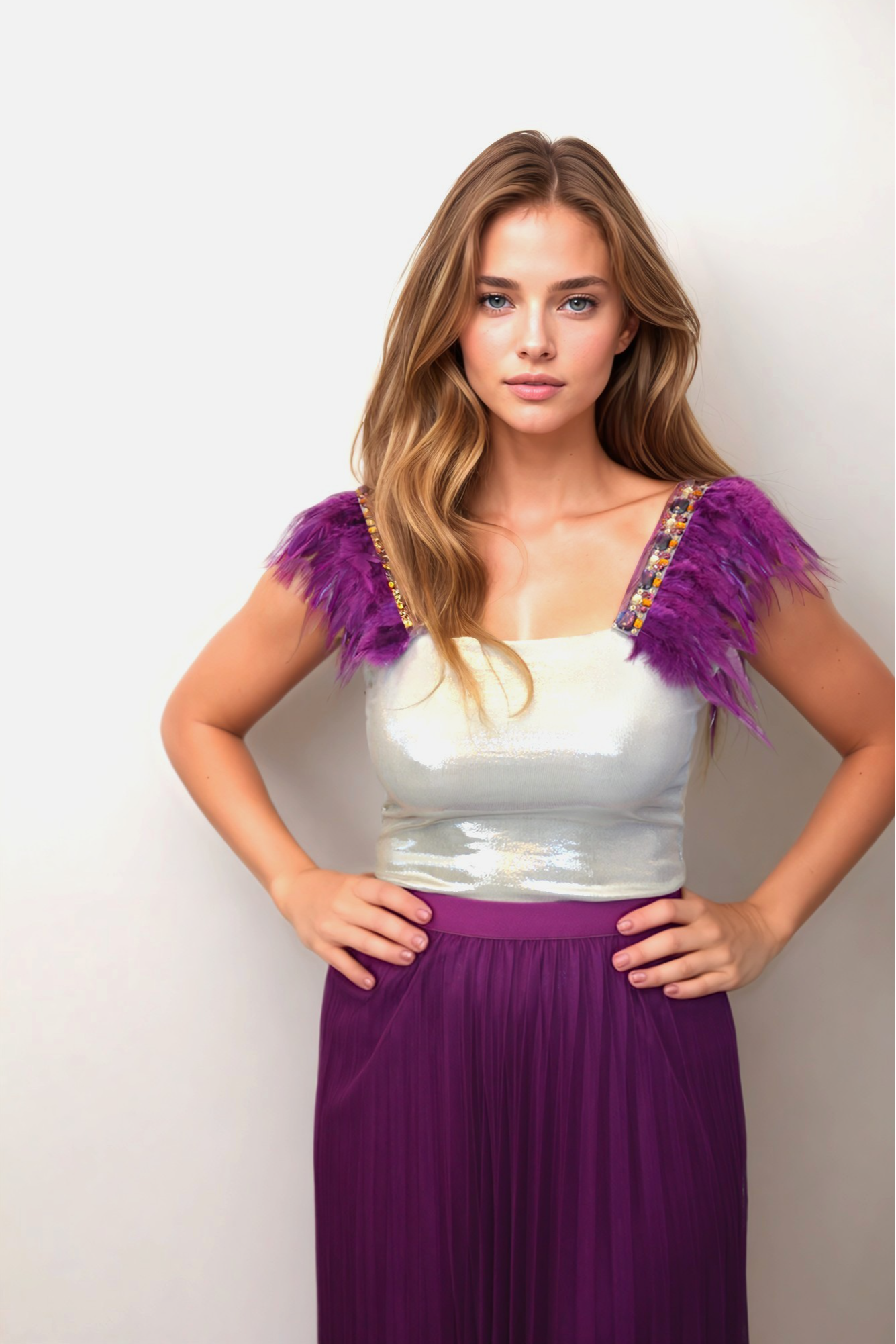 All Lara Bly originals are designed, cut and sewn at the fashion studio in Bethlehem Pennsylvania. Feathers are detachable for washing (hand wash).