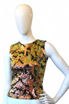 This piece dazzles with a sequin mosaic, capturing sunlight in an autumn spectrum of iridescent rose gold and bronze. The sleeveless, fitted silhouette is a celebration of texture and light, it’s a statement of bold elegance and radiant expression. The top is even more beautiful in person as it is hard to capture the beautiful colors of the iridescent fabric. It is also made of a stretch sequin fabric with a very soft rayon jersey lining. The length measures 2 inches from the top of the shoulder to the hem.