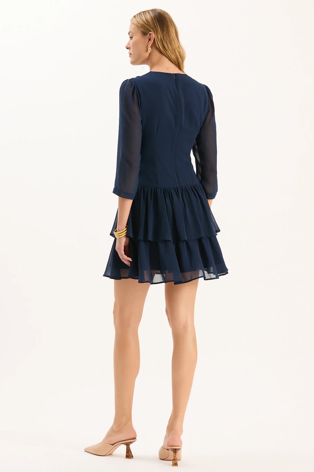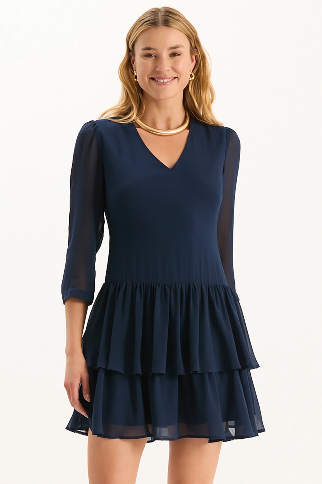 The Connie Georgette Dress is crafted from lightweight chiffon for soft movement and an airy feel. Designed with sheer sleeves, a graceful v-neckline, and a tiered skirt, it brings playful elegance to any occasion.