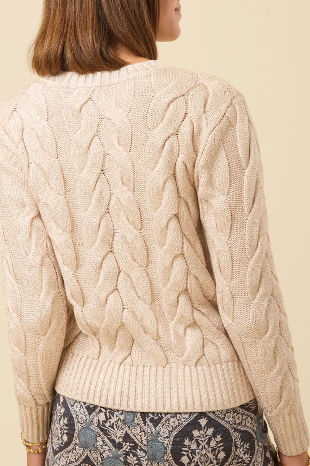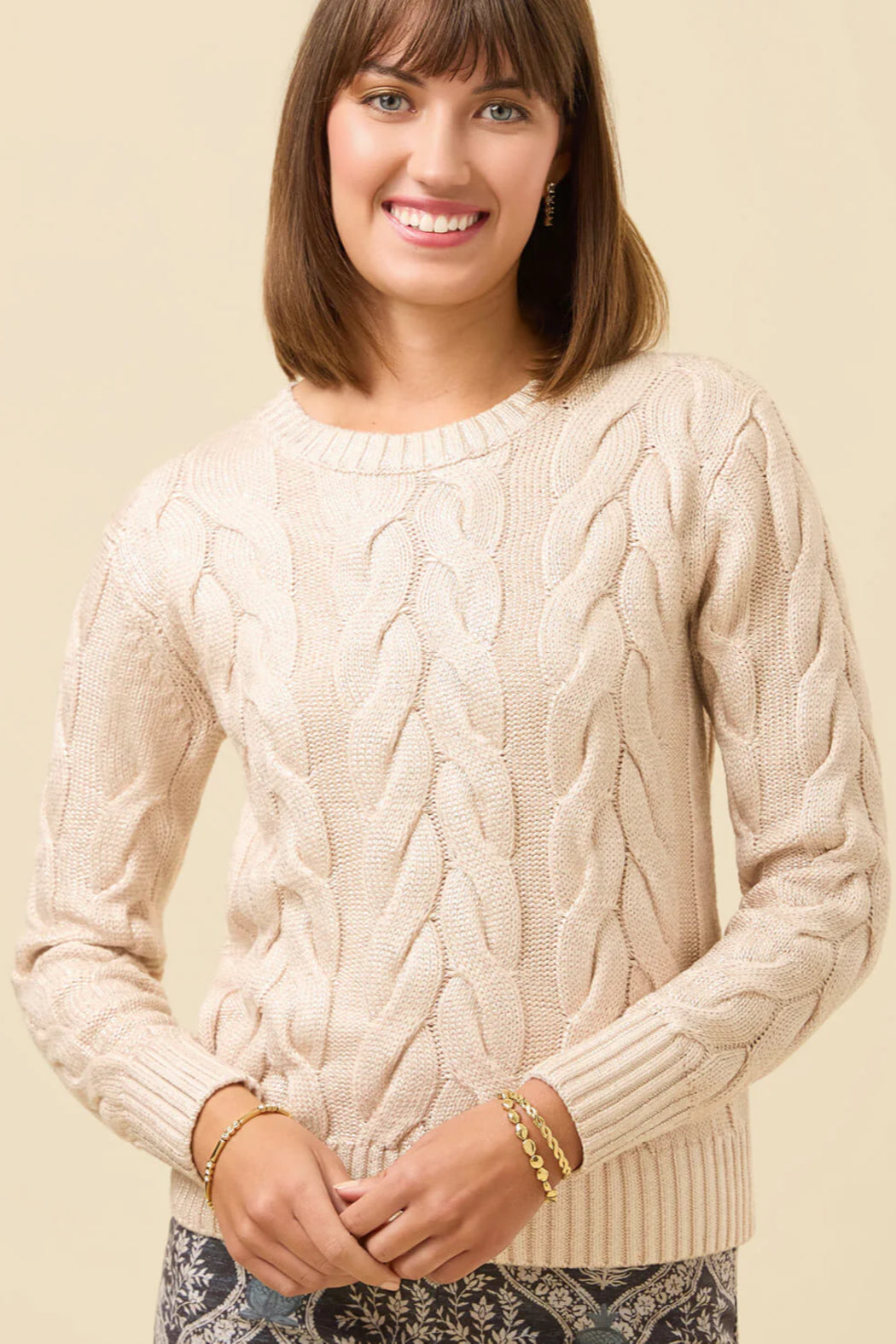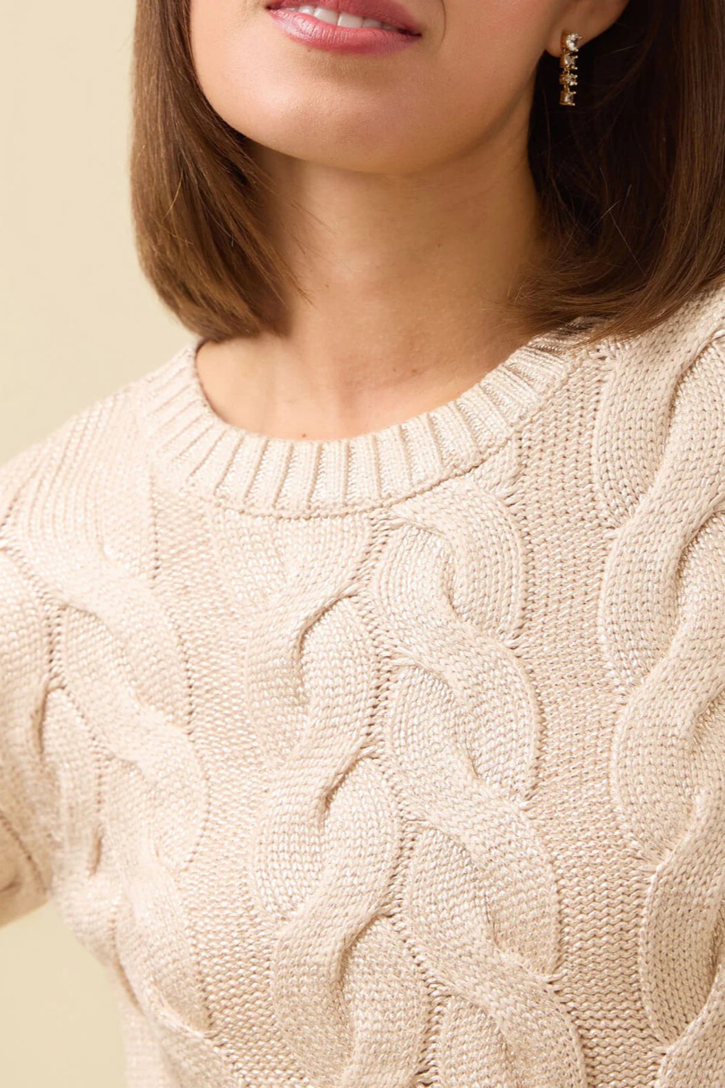 Chilly weather essential: our Florence Crewneck Sweater! Soft and comfortable with long sleeves and a relaxed fit, this 100% cotton sweater is adorned with a champagne foil that adds a luxe, eye-catching metallic detail. She's an elevated choice for both everyday outings and celebratory affairs. Adored for its bold foil finish. Long sleeve foiled cable-knit sweater. Crew neck. A warm and cozy knit for all-day comfort. How It Fits: Relaxed fit. Some stretch. Length from highest shoulder point: 20". Model Measurements: Height: 5'9''. Bust: 32B. Waist: 25''. Hip: 35''. 100% Cotton.