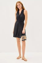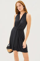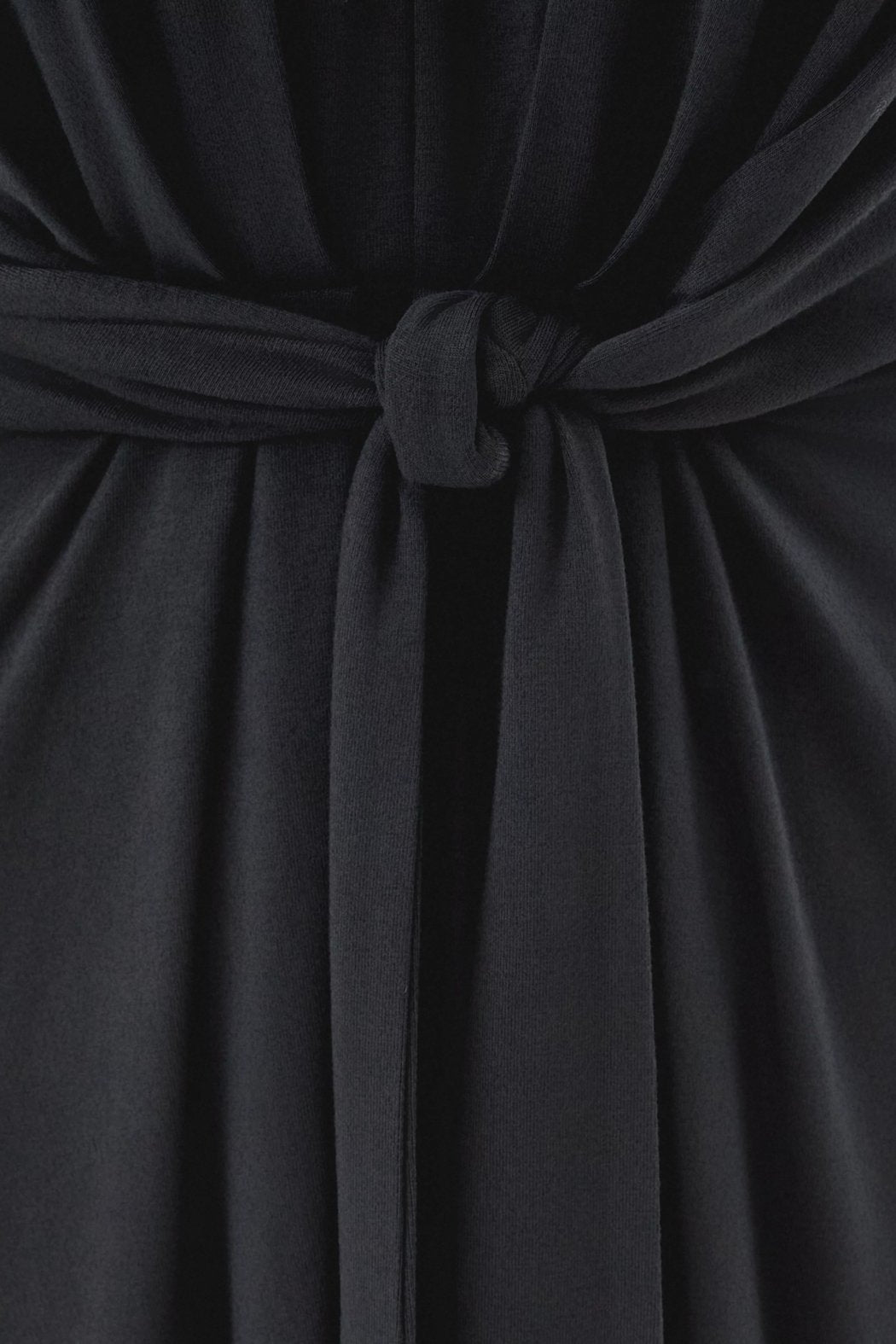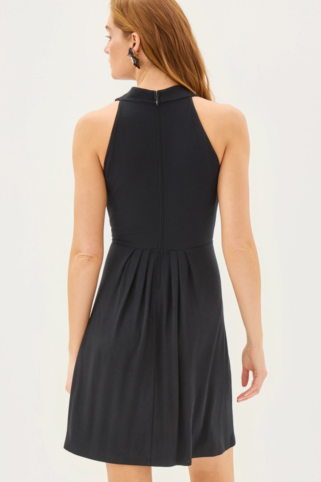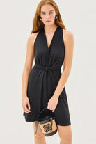 Fit-and-flare dress with a deep v-neckline, cut-in armholes, and a functional front tie detail at the waist.