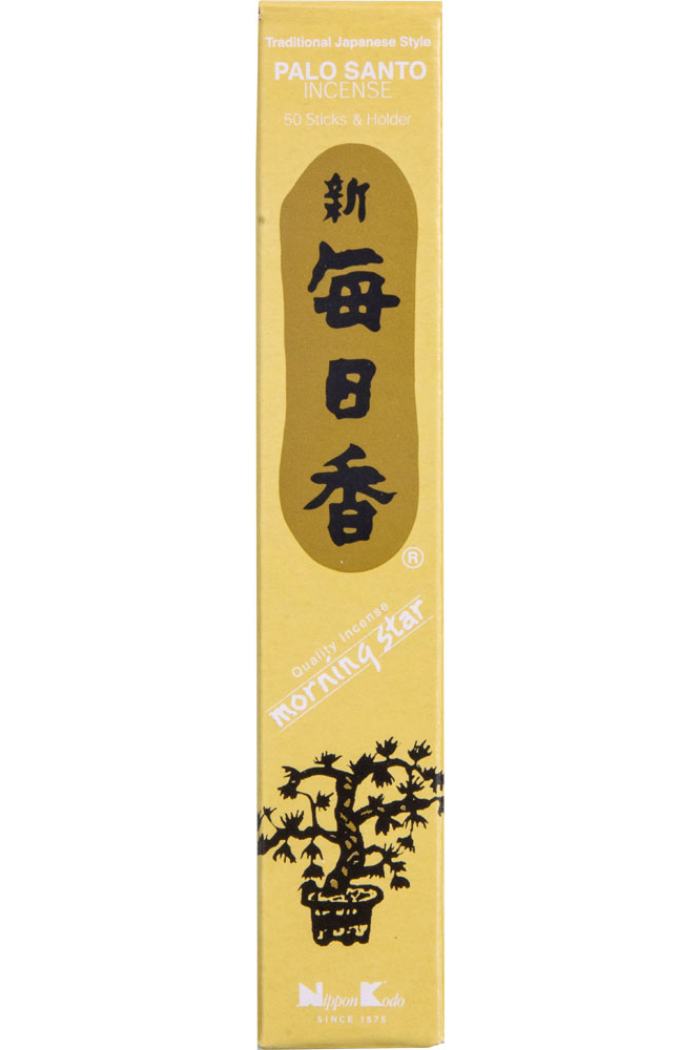 NIPPON KODO MORNING STAR Incense - Palo Santo will bring a scent of a aromatic woods to your place! Morning Star was born in the 1960s in Japan. It uses high-quality ingredients, such as floral essences and aromatic wooden chips, to create powerful fragrances. Morning Star is perfect for when you want to create a relaxing atmosphere for meditation, prayer, and yoga. 50 sticks in a box No bamboo core used Includes a ceramic tile burner Omits little smoke when burning Box includes a ceramic tile burner Perfect for "everyday" incense - For meditation, relaxation, reading, listening music, peace of mind Things to note: Key Note: Palo Santo Burn Time: Approx. 25 min 0.8 x 5.18 x 0.87"