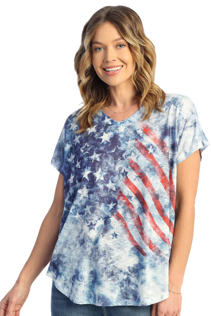 Patriotic tee with a V-neckline and dolman cap sleeve, this is THE tee to show your American pride and appropriate for various holidays. Proudly made in the USA