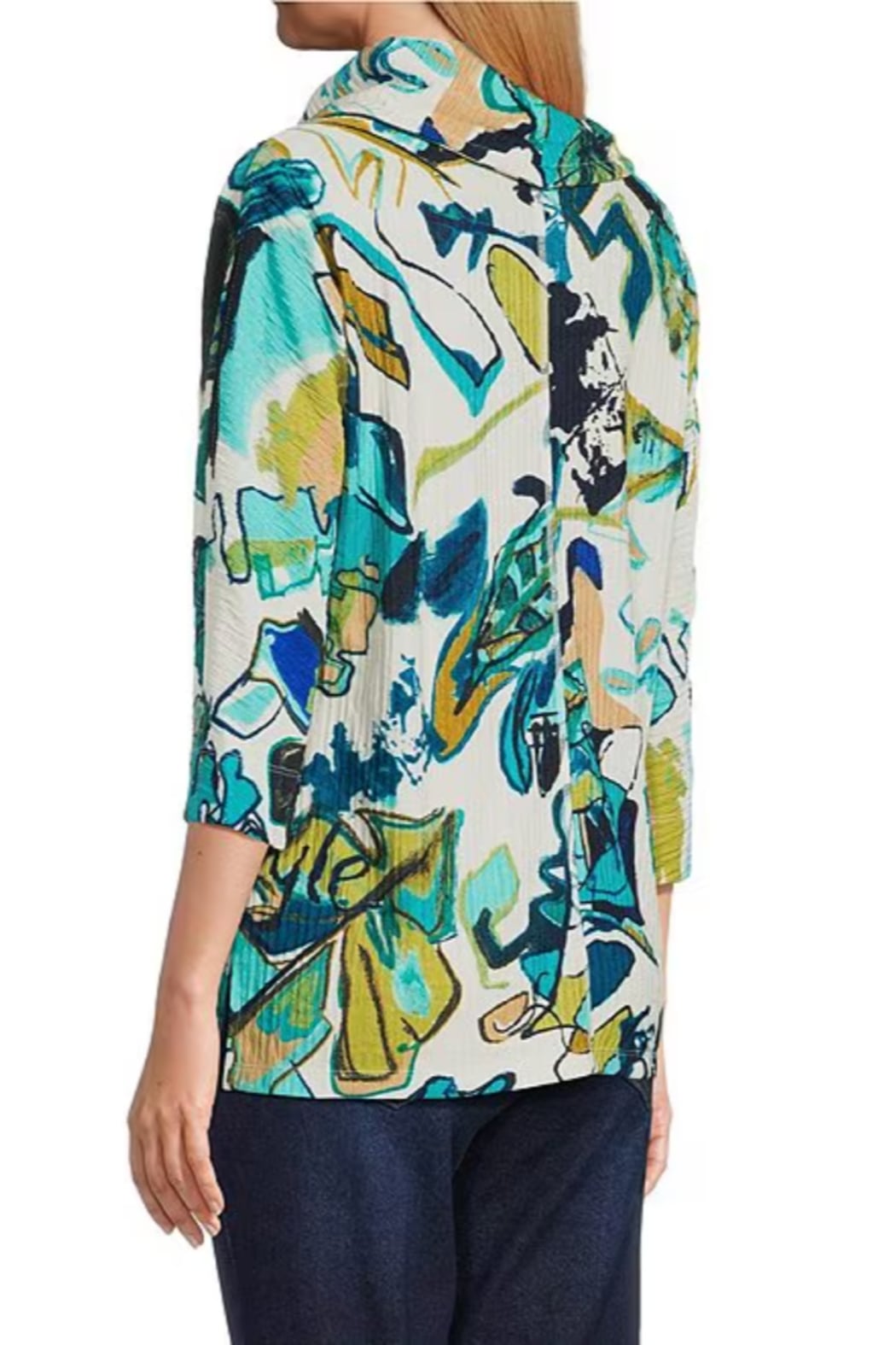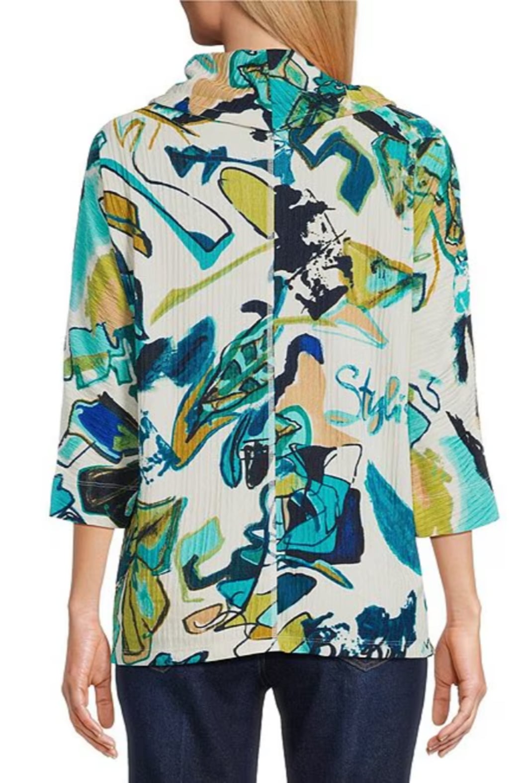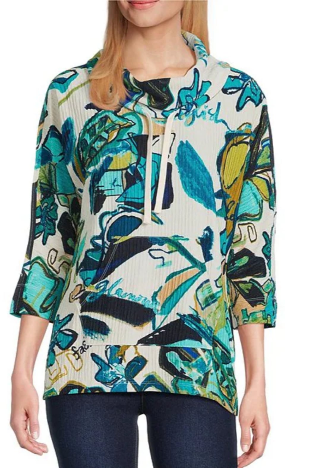 Cozy meets creative in this textured stripe knit top, designed with thoughtful details that elevate everyday comfort. A soft drawstring cowl collar adds a relaxed yet refined touch, while the placed print brings dimension and artistry to the look. Finished with a practical kangaroo pocket and a flattering 3/4 sleeve, it’s the perfect mix of laid-back ease and polished style.