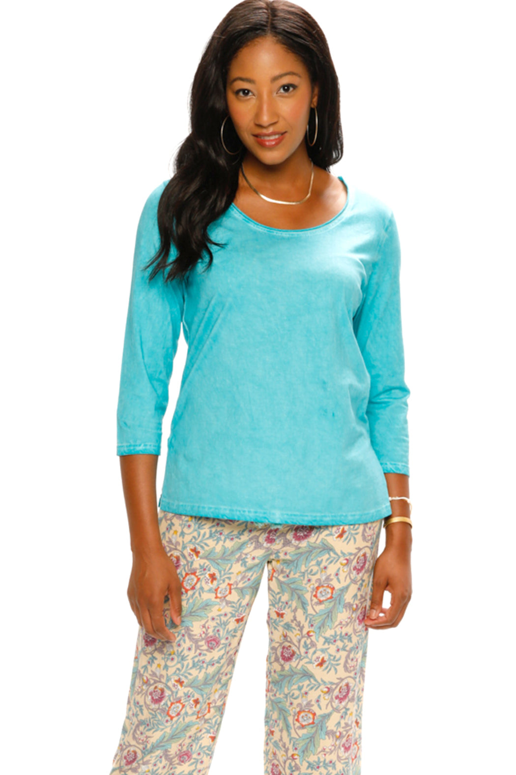 Wonderful staple for any closet, this 3/4 sleeve top has a rolled scoop flattering neckline, 3/4 length sleeves and vents on each side of the hemline. Basically all you could want in a great basic top PLUS a universally pleasing color.