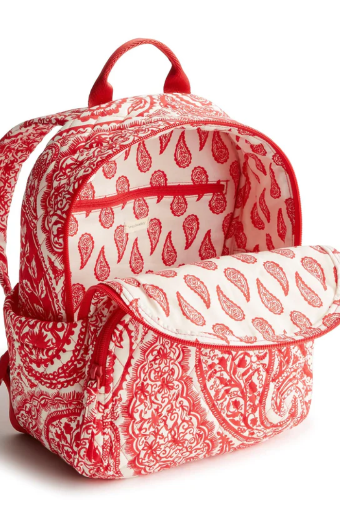 The Small Banbury Backpack in cheerful Paisley Key is a great year round bag in true red and white paisley and the perfect blend of style and convenience for your on-the-go lifestyle. Designed to carry your essentials while keeping your hands free, this backpack offers the ideal combination of functionality and practicality. Top handle and adjustable straps, with zip closure. The exterior features a back slip pocket, two side slip pockets and two zip compartments. The interior features two slip pockets and a zip pocket. Small but mighty!!