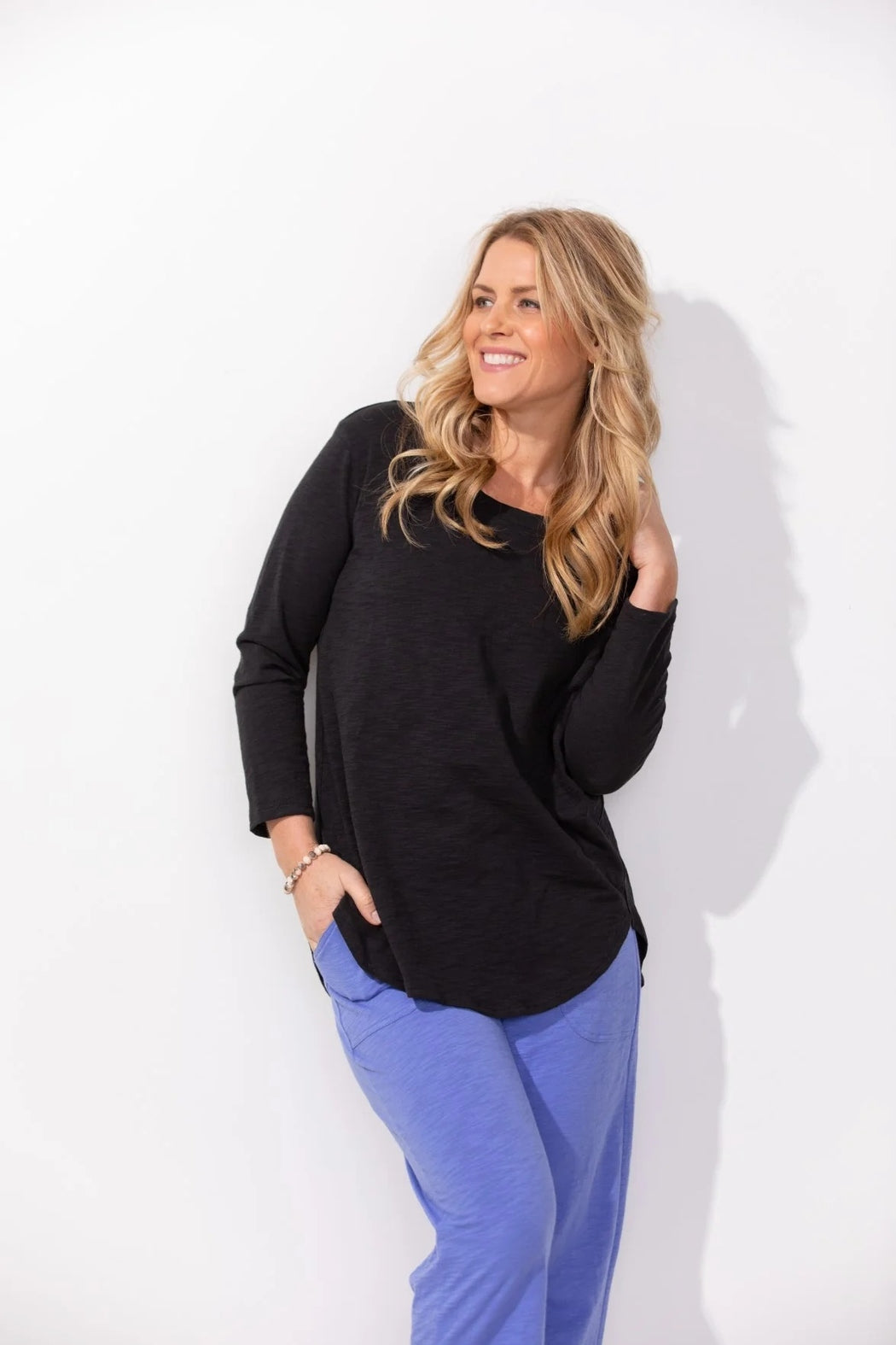 This Hi-Lo tee is crafted from soft, medium-weight slub cotton for a comfortable feel and an easy, flattering drape. It features a scoop neckline, three-quarter sleeves, and a gently curved hi-lo hemline for added shape and movement. Made from 100% cotton and designed for a relaxed fit, it’s perfect for effortless everyday wear.