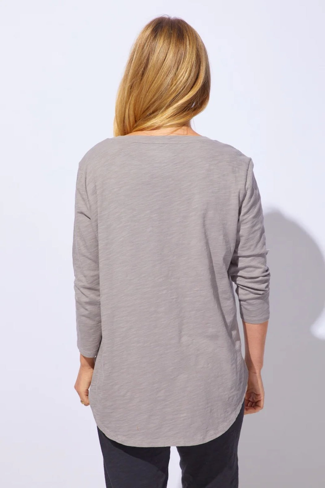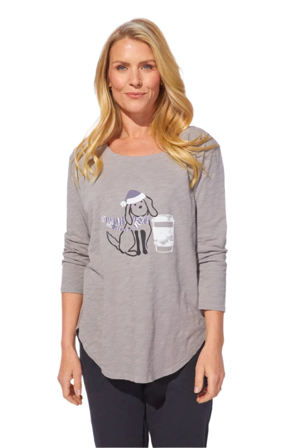 "Crafted from premium cotton known for its exceptional softness, durability, and lasting quality, this tee features slub-textured yarns that create a beautifully unique finish. The Pup Cup Tee is perfect for dog lovers, designed with a scoop neckline, edge stitching, rounded hems, a slightly longer back, and three-quarter sleeves for an easy, flattering fit.
