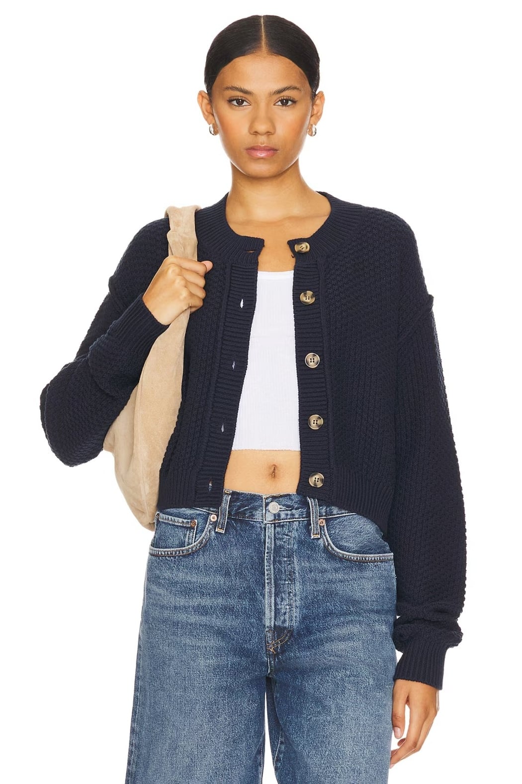 This navy knit sweater brings a cozy, polished feel to everyday dressing. Designed with a textured weave, a clean crew neckline, and standout gold-tone buttons, it offers an easy, modern layer you can style with denim, trousers, or over a simple tank. Perfect for casual days, coffee runs, or adding effortless structure to your weekly rotation.