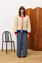 Add a playful pop of color to your look with this soft and fluffy curly knit vest. Designed in a straight cut with long, slightly balloon sleeves, it features a button-front closure and contrasting trim along the neckline, cuffs, placket, and hem. The vibrant mix of ecru, pink, red, and blue brings cheerful energy to any outfit.