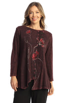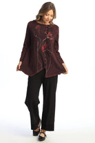 Artful and effortless, this long sleeve top features a painterly floral design on a rich burgundy backdrop. Crafted from soft, breathable fabric with an easy, flowy fit and asymmetrical hem - perfect for adding a touch of elegance to everyday wear.