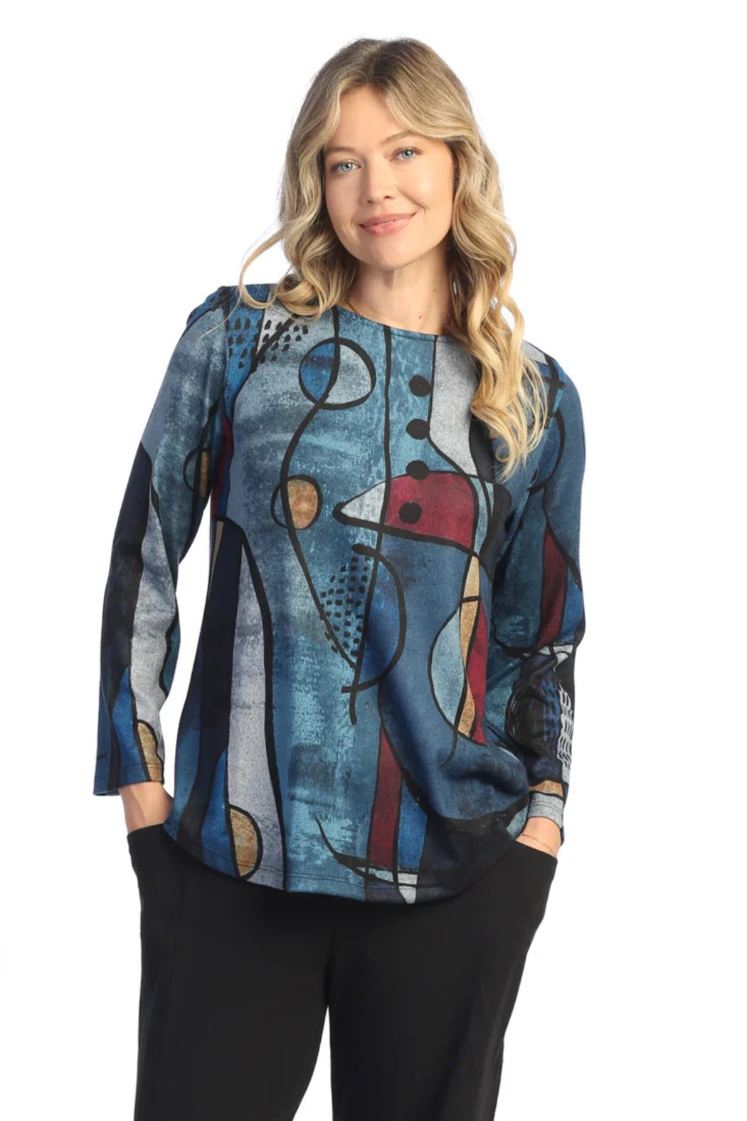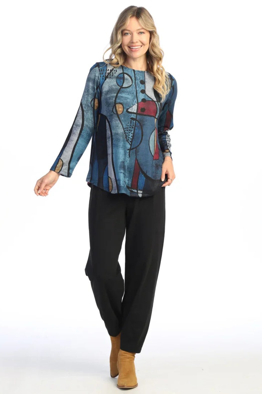 Make an artful statement in this scoop neck tunic, featuring a cubist-inspired print in deep blues, bold black lines, and hints of merlot and gold. Crafted from soft, stretchy brushed jersey with a heathered finish, it offers cozy comfort with a touch of sophistication. The long sleeves and rounded hem that falls below the hip create a flattering, easy-to-wear silhouette perfect for everyday elegance.