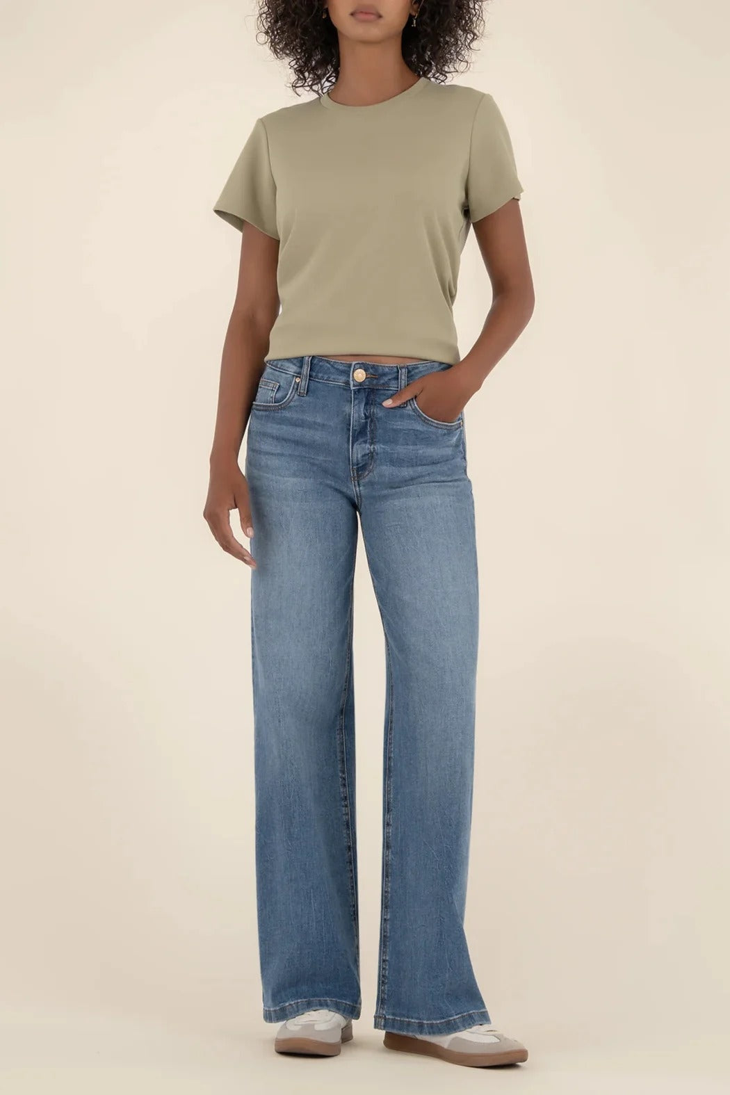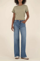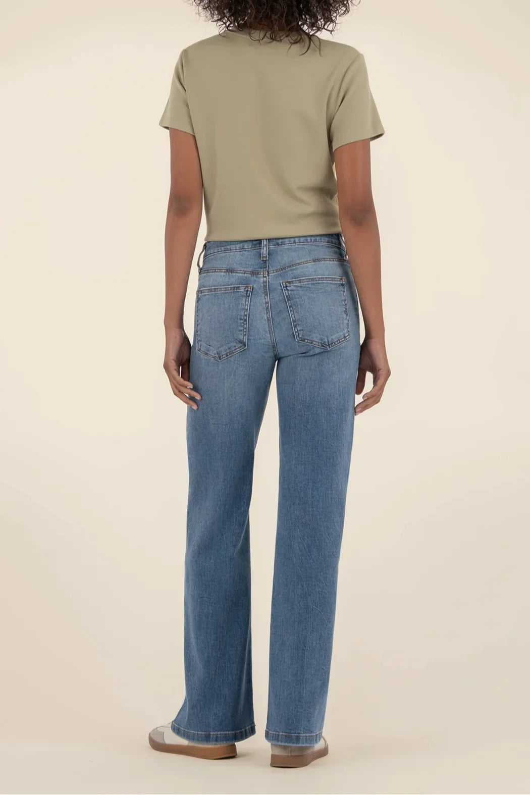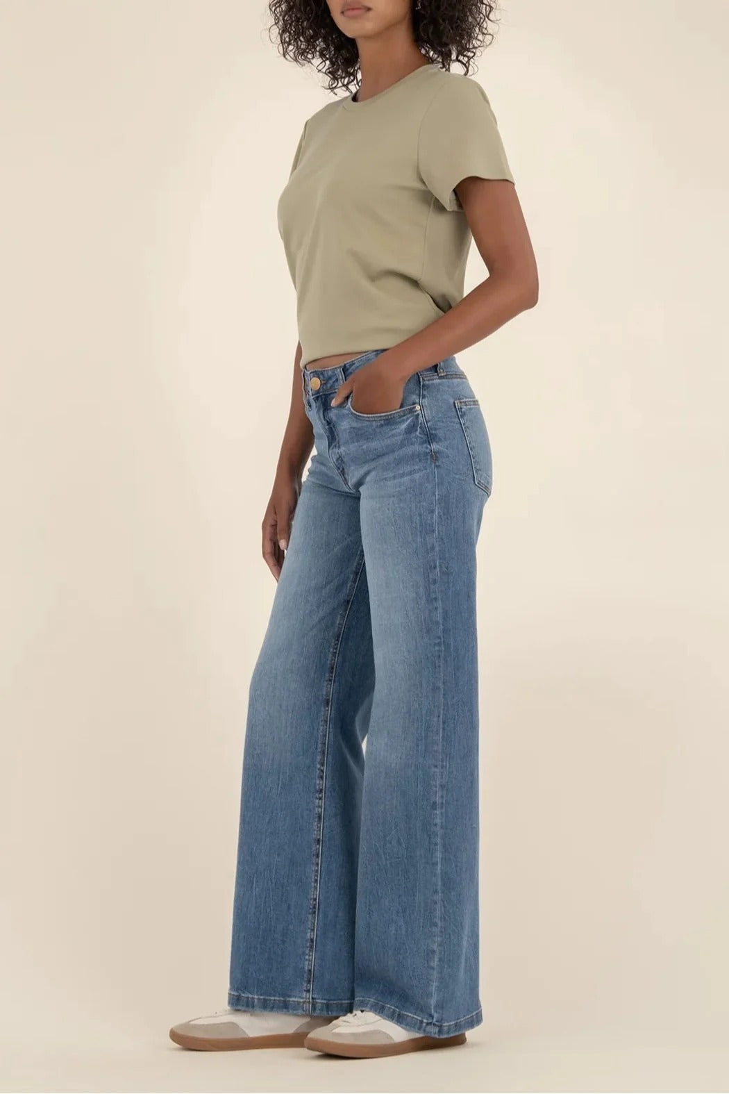 Step up your everyday look with these high-rise wide-leg jeans in a timeless medium wash. Crafted from soft, stretchy fabric, they deliver a comfortable fit and a flattering full-length silhouette. Easy to dress up or down, they’re a versatile staple for any wardrobe.