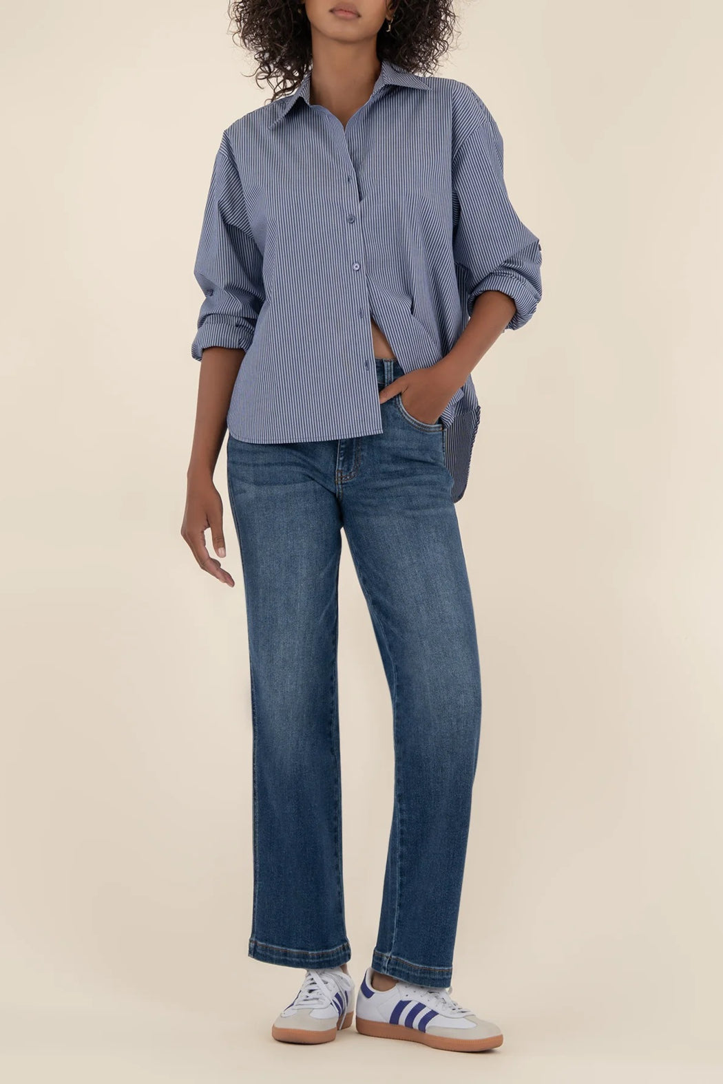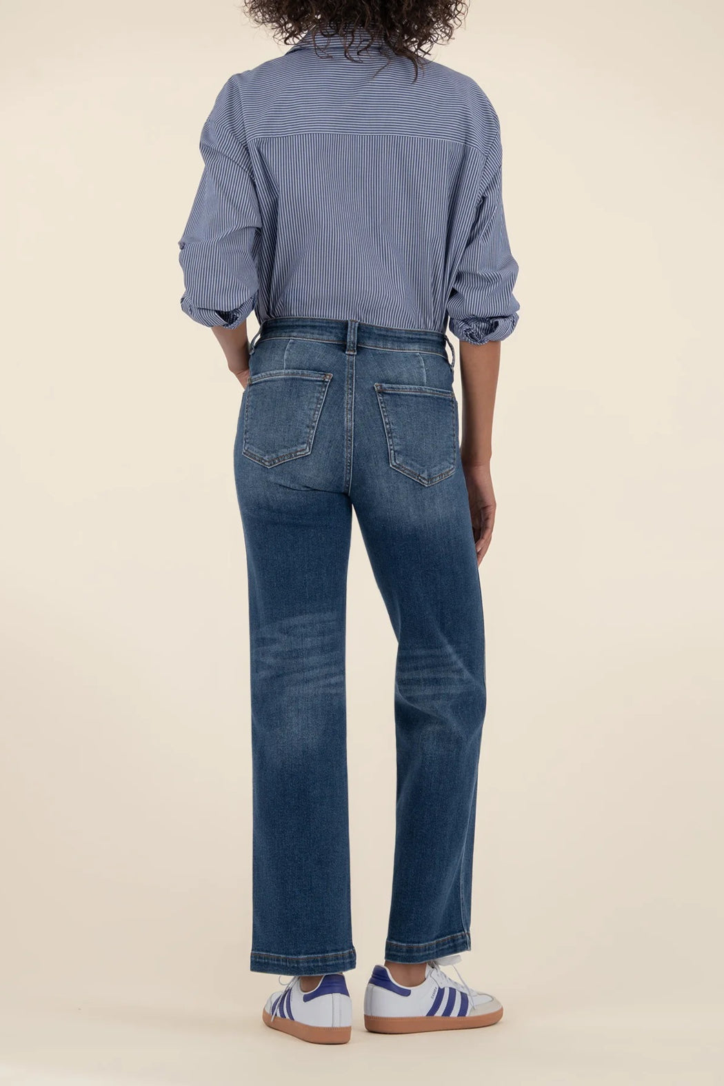 These high-rise straight-leg jeans combine timeless style with a modern touch. Designed with back darts for a flattering shape and classic five-pocket detailing, they offer a clean, versatile look that’s effortlessly chic season after season.