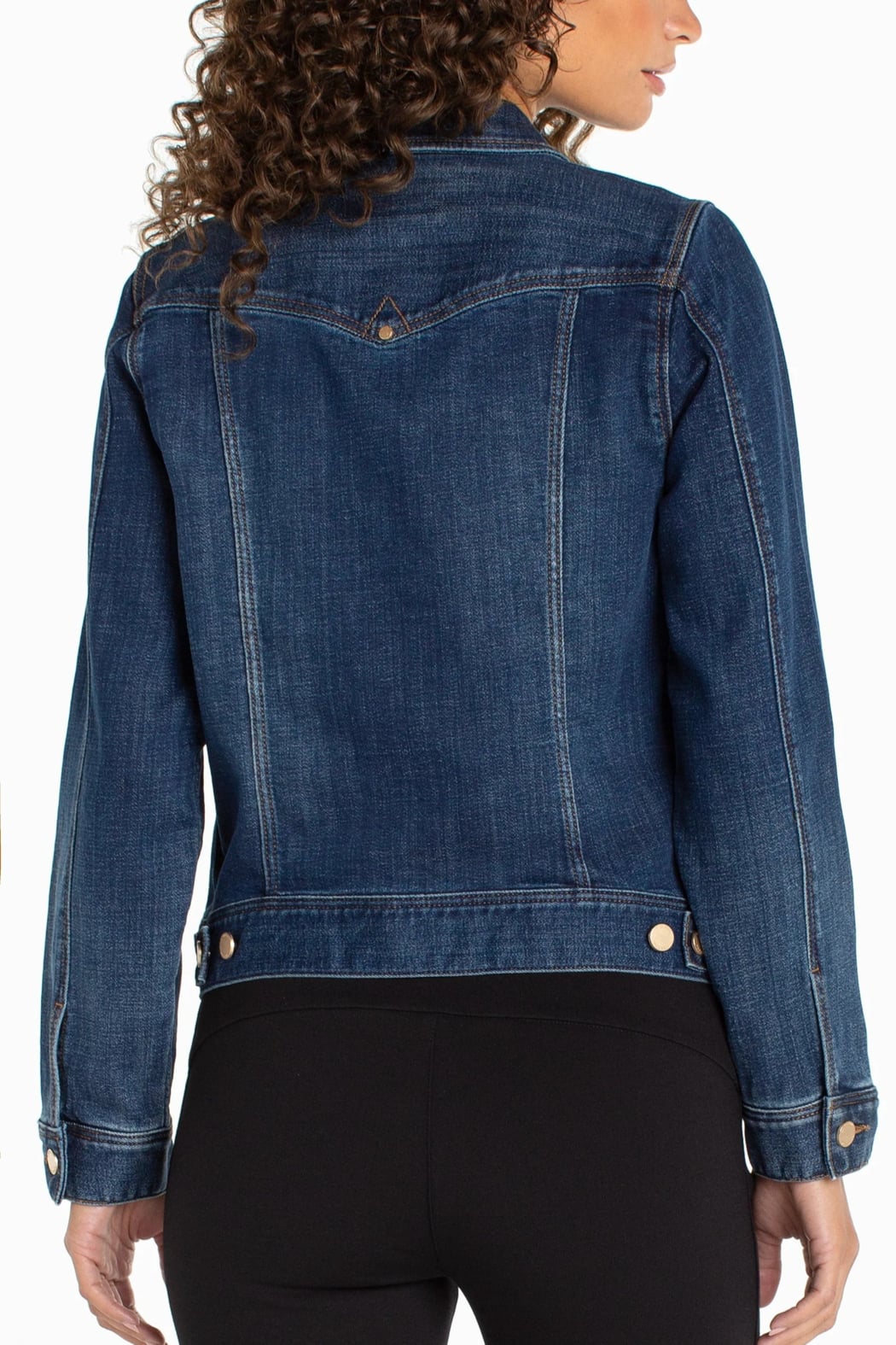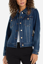 This deep indigo jacket brings new life to a classic denim shape. An intricately beaded crest patch and delicate crystal accents along the pockets add a touch of artistry and shine. Designed with soft stretch and carefully placed tailoring, it offers comfortable movement and a flattering fit. This is the kind of piece that instantly elevates your look and brings a hint of sophistication to everyday style.