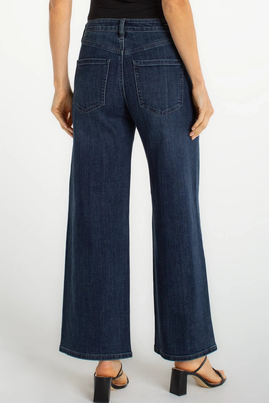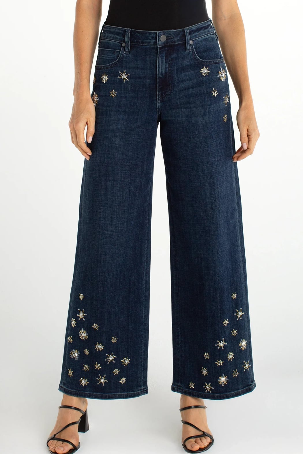 A refined take on subtle glamour. This deep indigo wide leg is finished with light-catching crystal clusters that add a soft, elegant shimmer. Crafted with our signature soft stretch and flattering structure, it brings a touch of luxury to everyday denim.