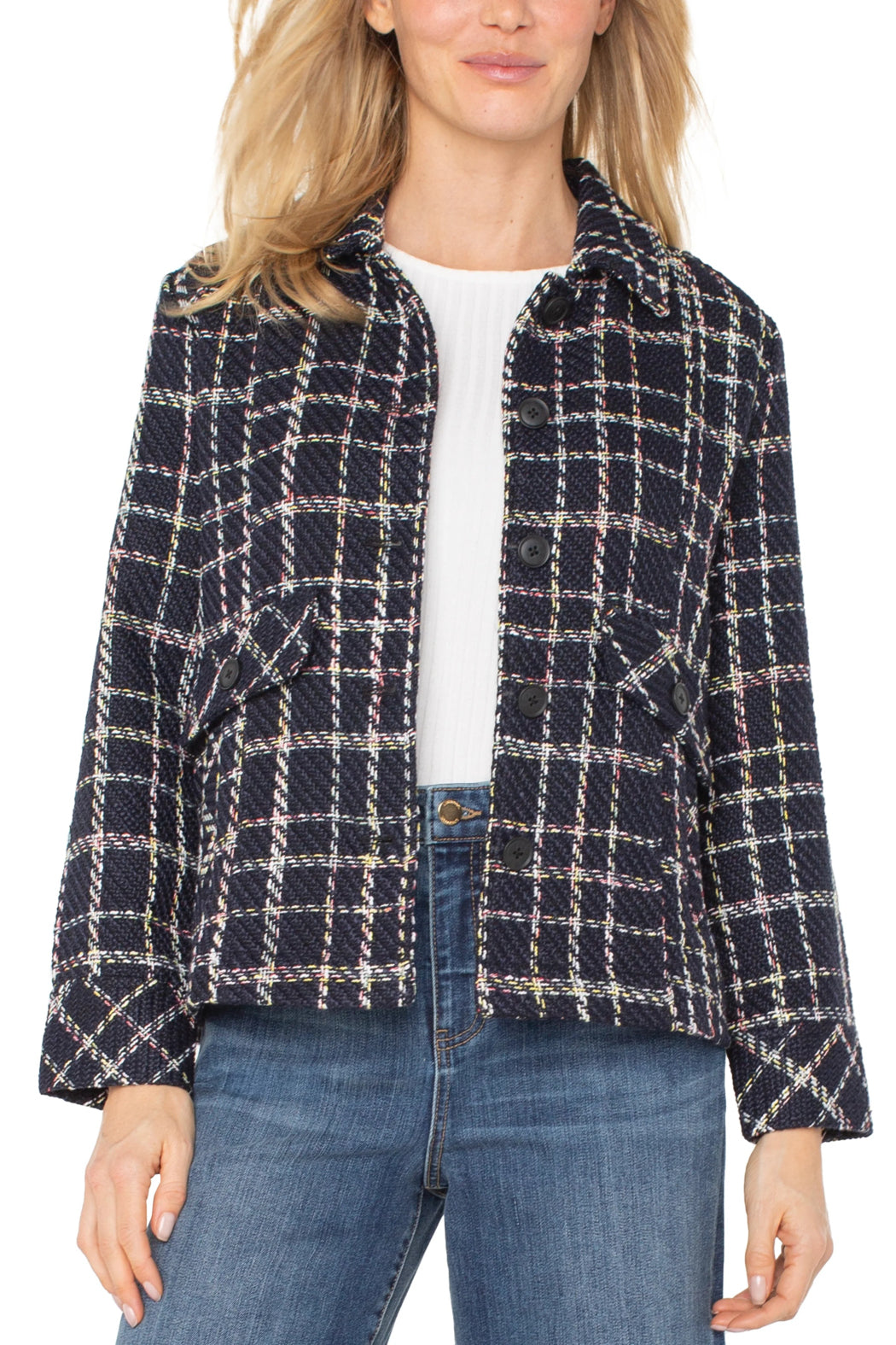 This plaid jacket combines structure and flow for a effortlessly stylish look. The pleated back adds graceful movement, while the structured front with flap pockets and button closure creates a polished finish. It is a versatile piece that brings depth, texture, and sophistication to any outfit.