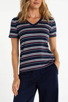 Simple yet full of personality. This striped V-neck tee blends classic navy and white with a bold fire brick accent for a fresh twist on an everyday favorite. Easy to pair with denim, tailored pants, or layered under your go to jacket, it brings a clean, modern feel to any casual look.