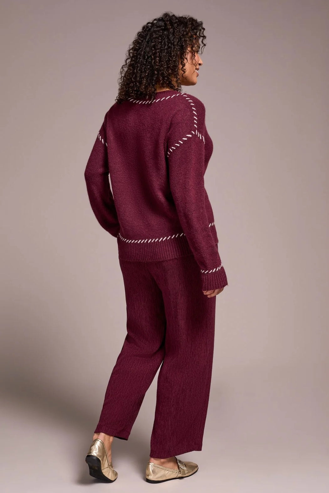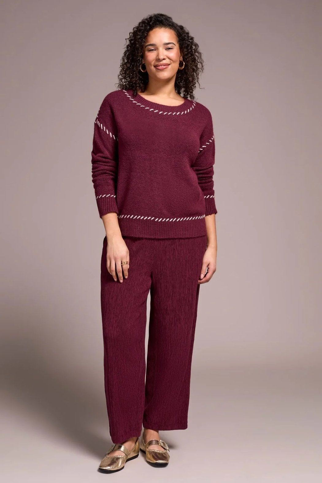 Enjoy all-day comfort in this relaxed sweater, designed with a classic crew neckline and long sleeves for a cozy, easy fit. The exaggerated saddle stitching along the neck, shoulders, and hem adds subtle structure and stylish detail. Made from soft yarn, it delivers lasting warmth with effortless appeal.