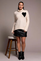 Bring a touch of charm to your cold-weather style with this statement sweater, showcasing a bold intarsia heart motif across the chest. Crafted from a soft, textured hairy acrylic blend for warmth and comfort, it features a cozy turtleneck, long sleeves, and a flattering high-low hem for an effortlessly chic look.