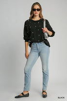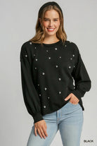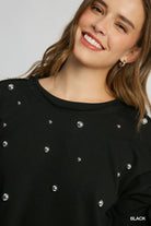 Add a touch of edge to your casual wardrobe with this French terry top featuring metallic studs for a subtle shimmer. Designed with a relaxed, boxy fit, round neckline, and raw hem detailing, it pairs effortlessly with denim or faux leather for a chic, laid-back look that stands out.