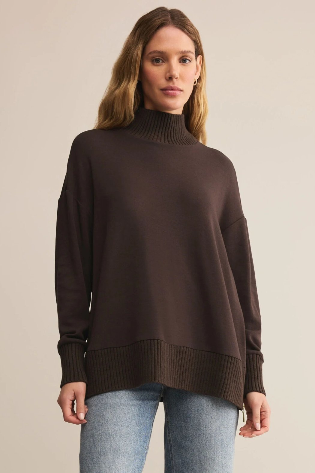 Crafted from a sleek midweight knit, this mock neck top offers a relaxed fit you’ll love to wear on repeat. The ribbed trim adds just the right amount of texture, while the side zips let you style it your way -- keep it loose and casual or zip it up for a more polished look.