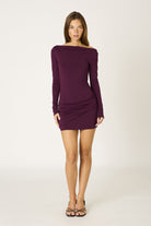 This long sleeve stretch mini dress, in a bold plum color, features a fitted silhouette with an off-the-shoulder neckline, ruched side detailing, and a bodycon finish.