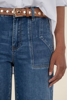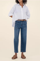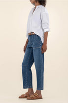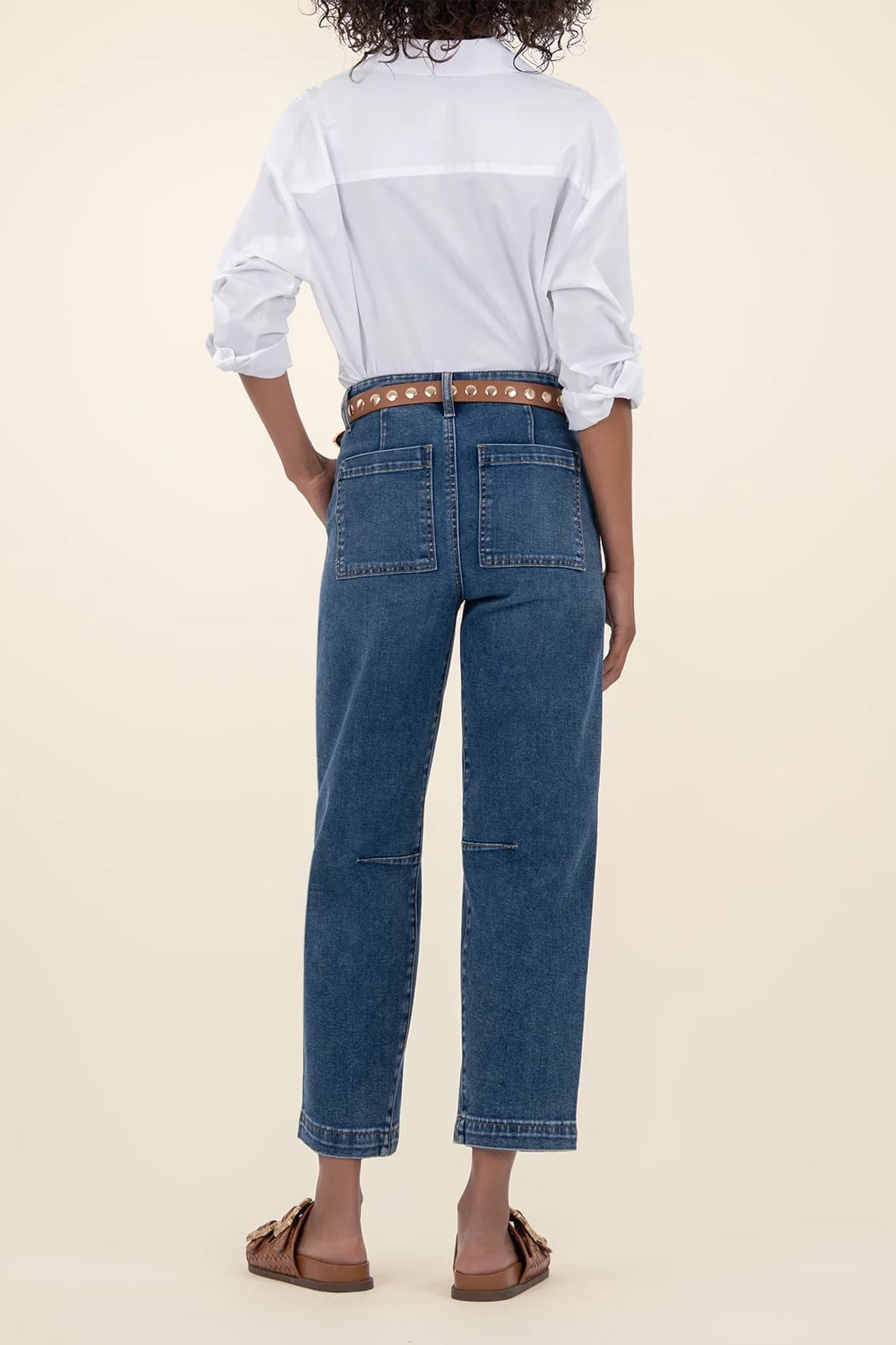 Elevate your denim game with the Ashton high rise barrel pant in a versatile medium wash. Designed for a modern silhouette, these pants feature a flattering barrel leg shape that offers both comfort and style. The clean hem adds a refined finish while the unique porkchop pocket adds visual interest.