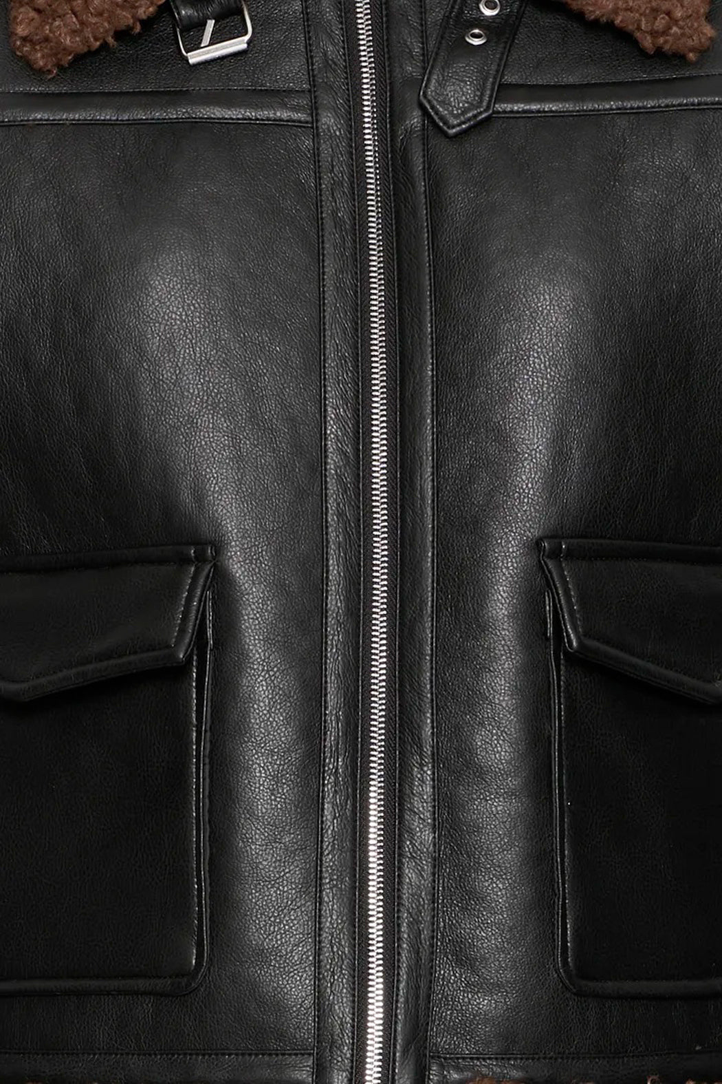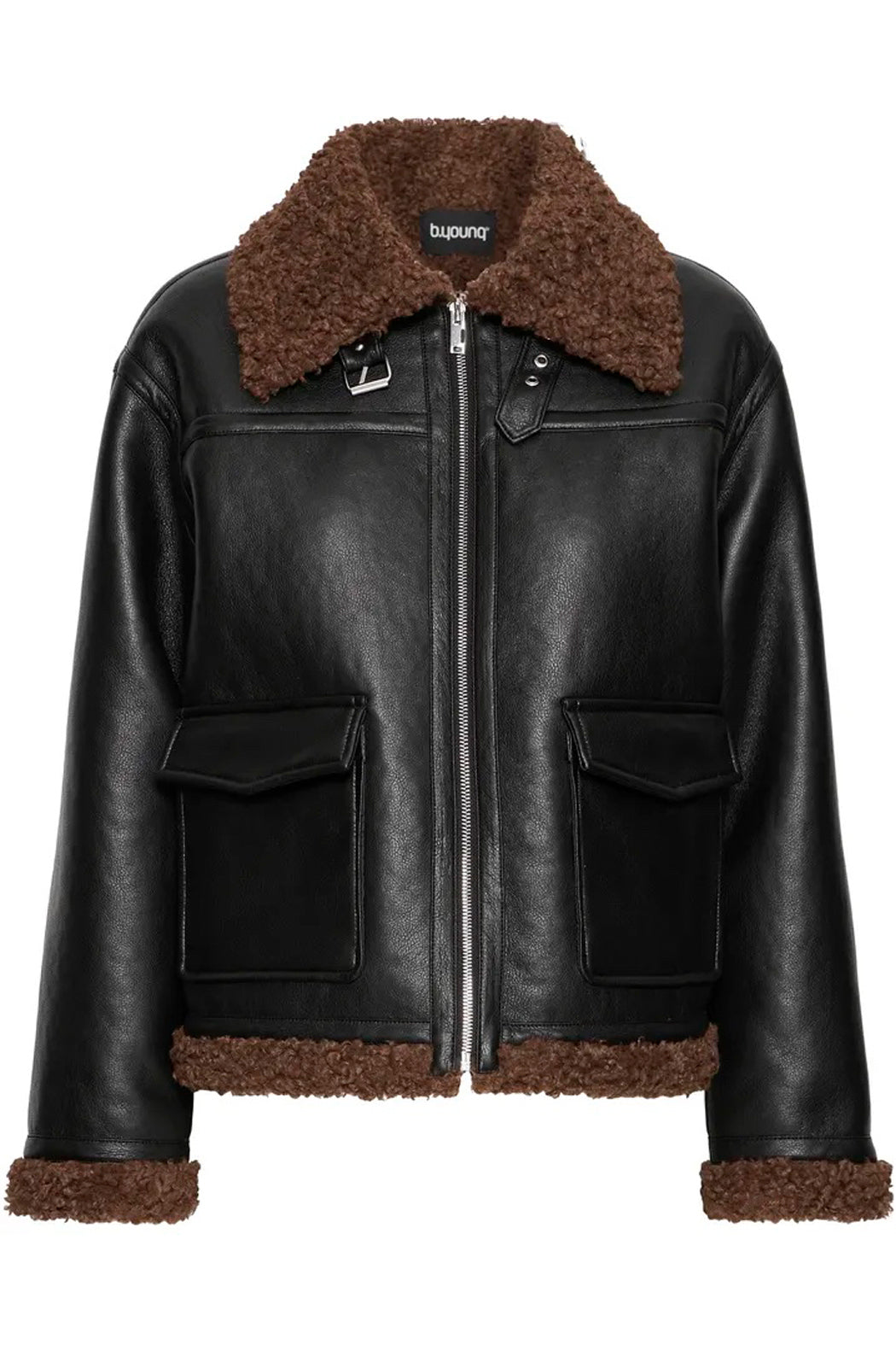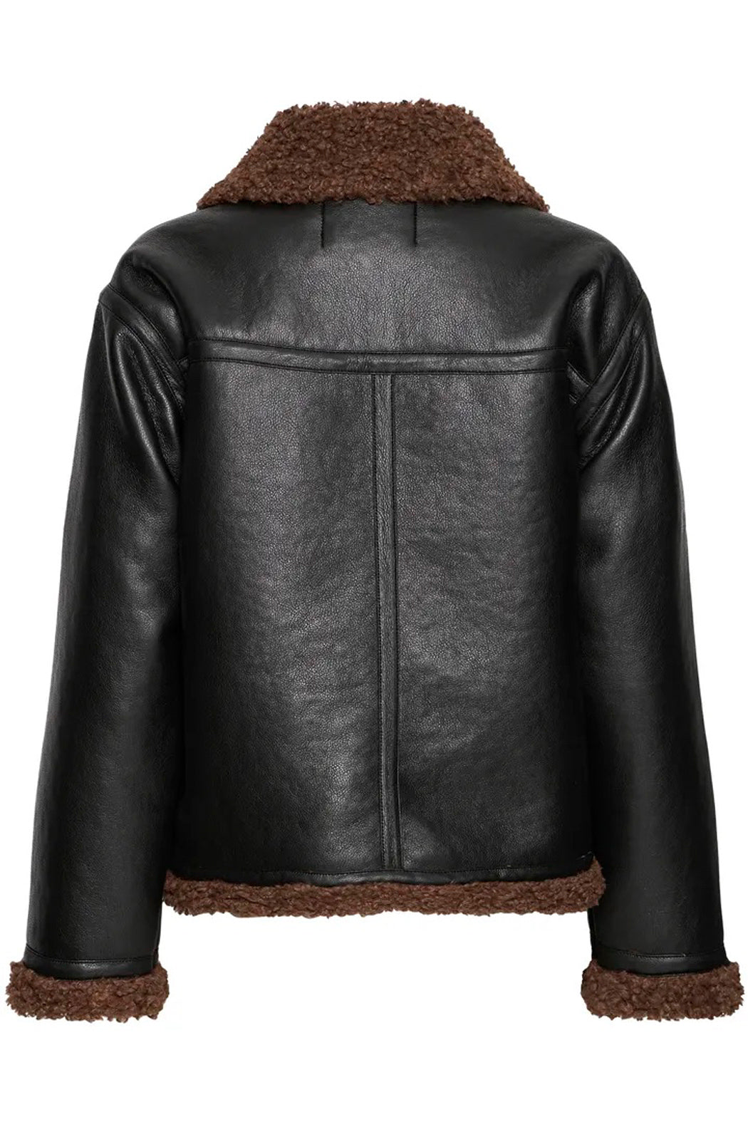 Where statement piece meets practicality there is the Balino Jacket. This faux leather moto style jacket features a chocolate brown shearling lining that is both soft and warm. The fold over collar, moto details, and deep front pockets complete the look.