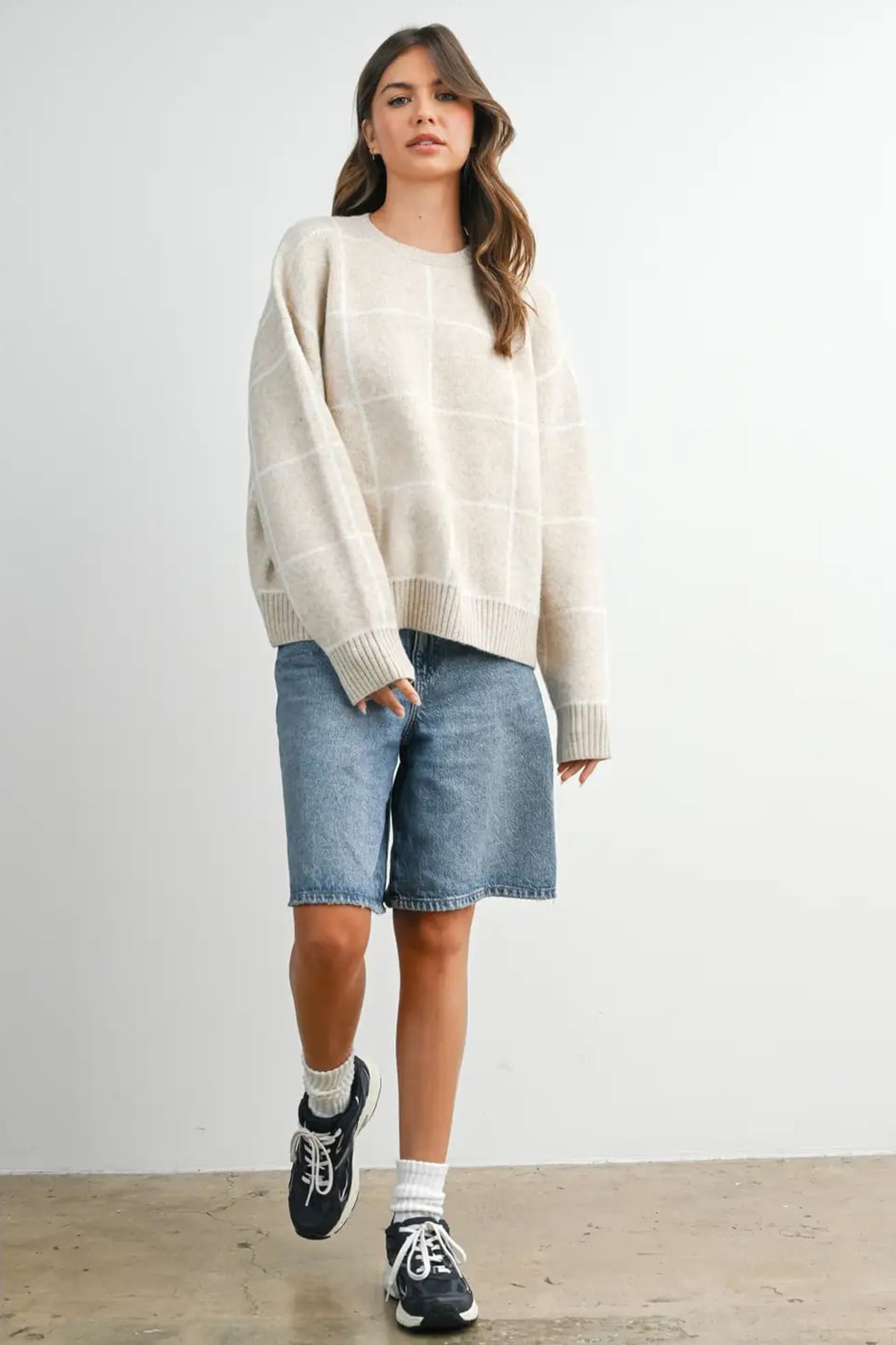 The relaxed fit and crew neckline of the Charlie Sweater make it versatile - you could easily dress it up with tailored trousers or a midi skirt, or keep it casual with jeans or shorts like shown. The knit texture looks cozy but not too heavy, making it great for layering or wearing on its own during milder days.