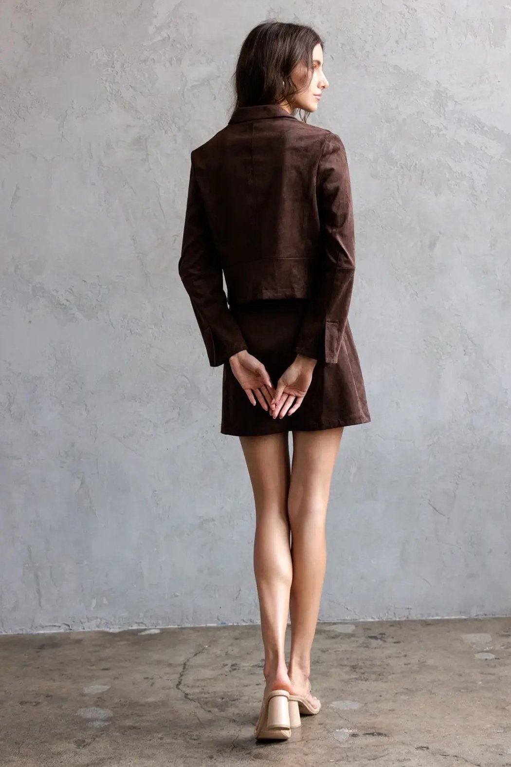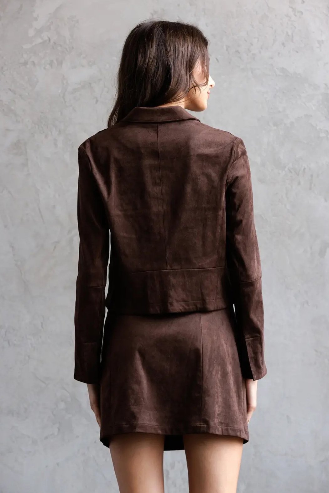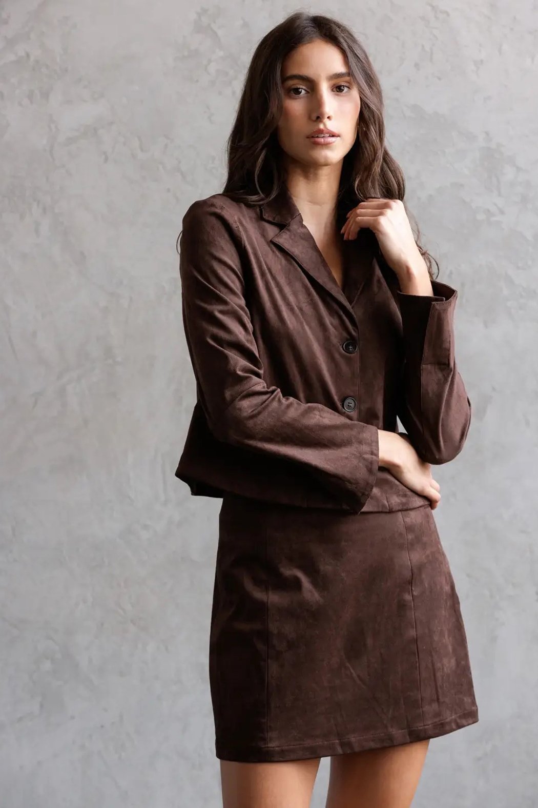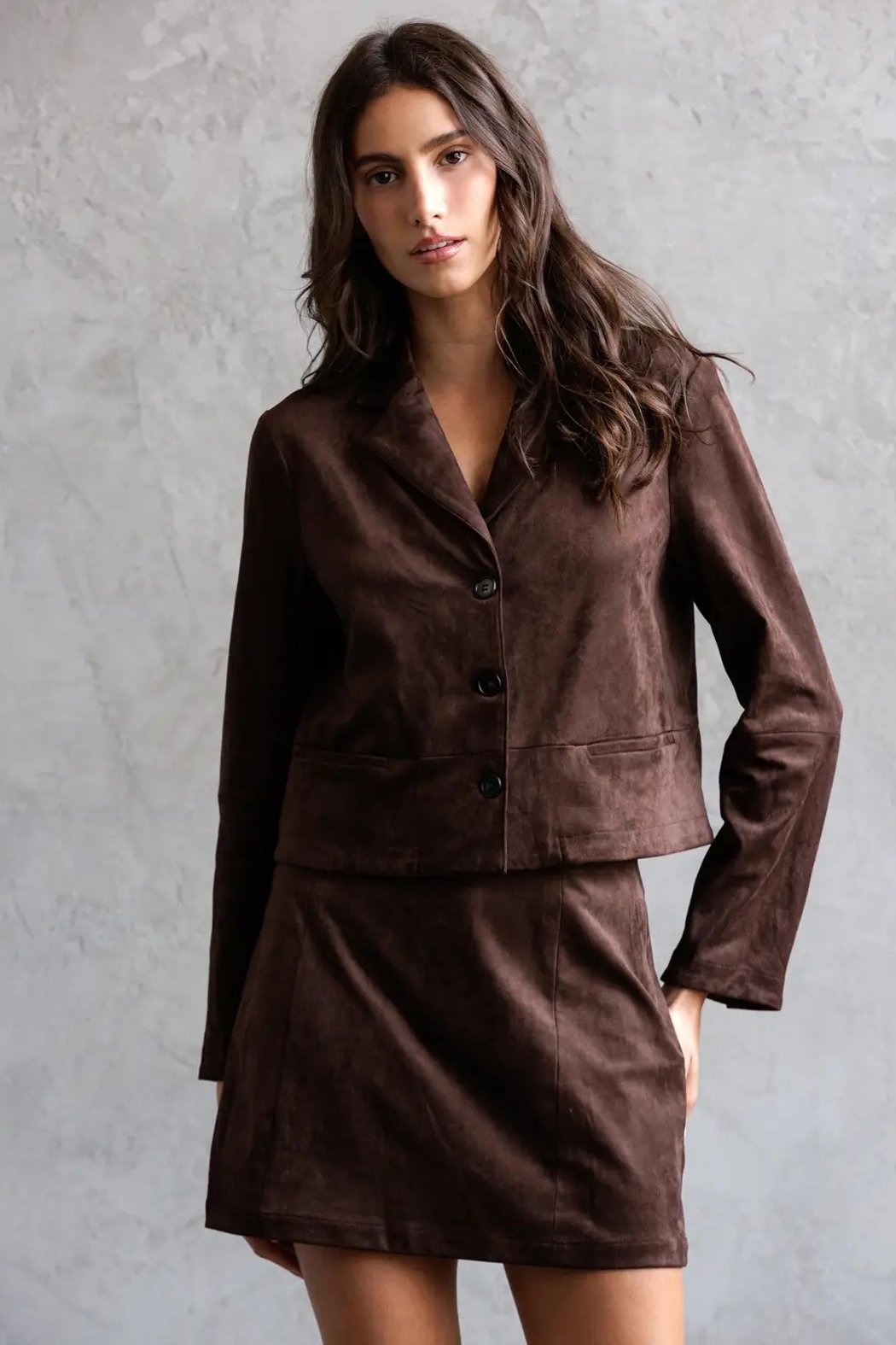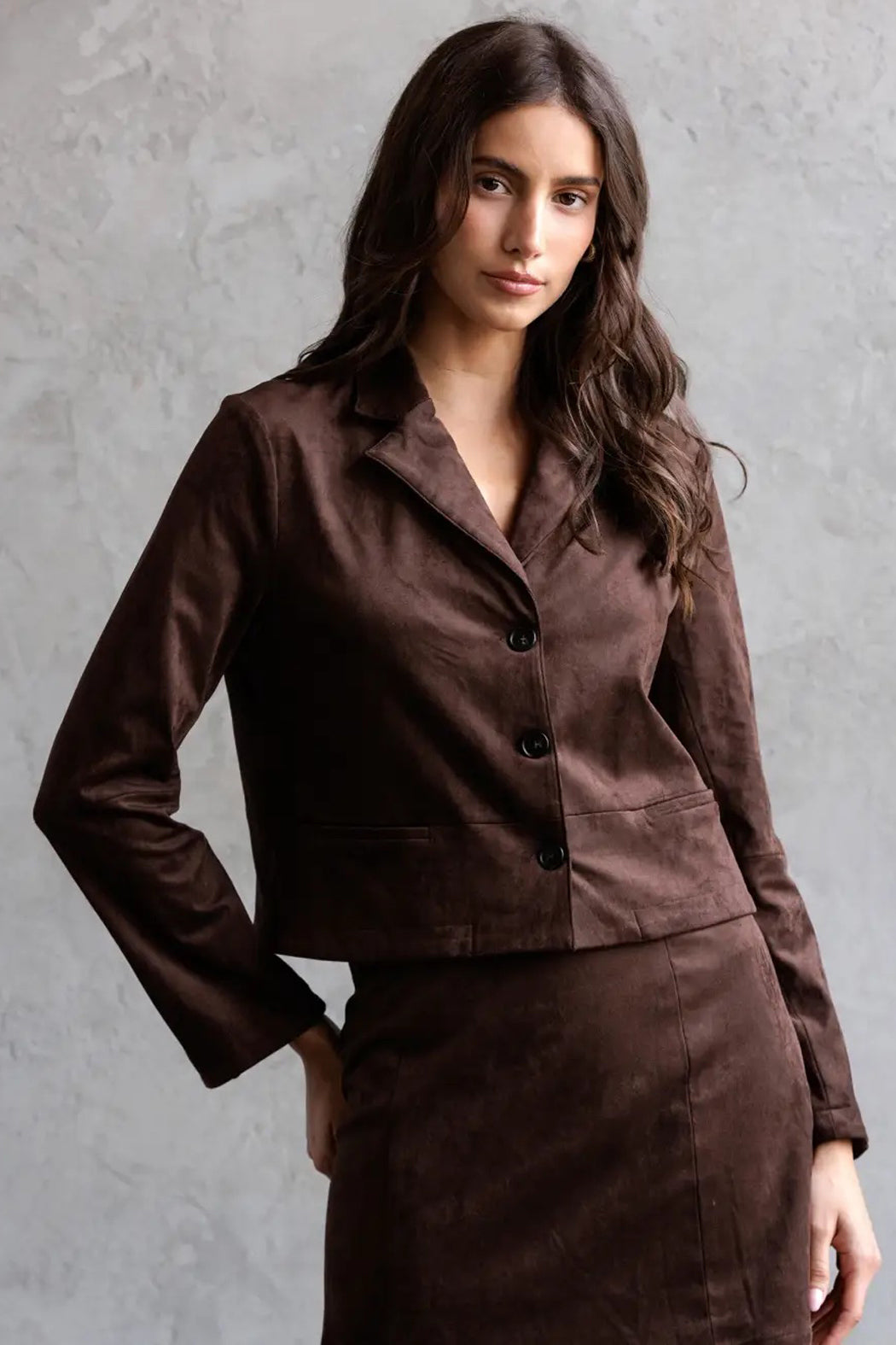 The perfect fall jacket, in a rich chocolate brown, this faux suede jacket features a blazer style collar, three buttons and real welt pockets in the front. Pair with a white crew neck t-shirt and the Pleaser Wide Leg jean for a casual yet put together look.