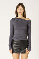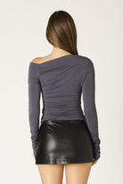 This stretch jersey long sleeve top features an asymmetric off-shoulder neckline with ruched detailing throughout and a fitted silhouette. Pair with the Inky Mini Skirt and a tall boot for the ultimate night out look. Follow @lunaboutiquecanton on instagram and DM us with any questions :)