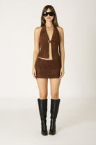 This faux suede mini skirt features a low-rise waist with grommet trim and a fitted, streamlined silhouette. Pair with the Hails Suede Halter Top to complete the set.