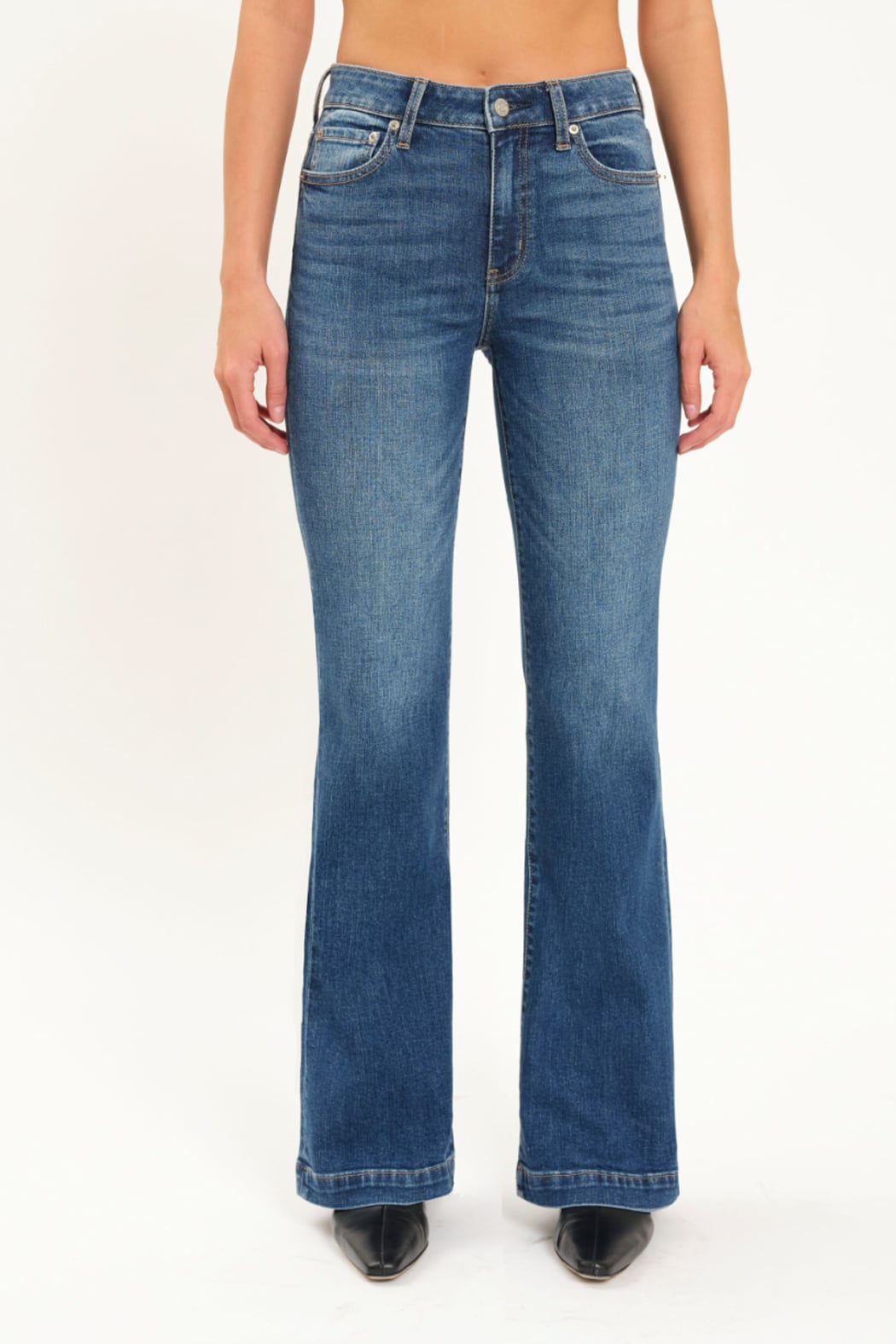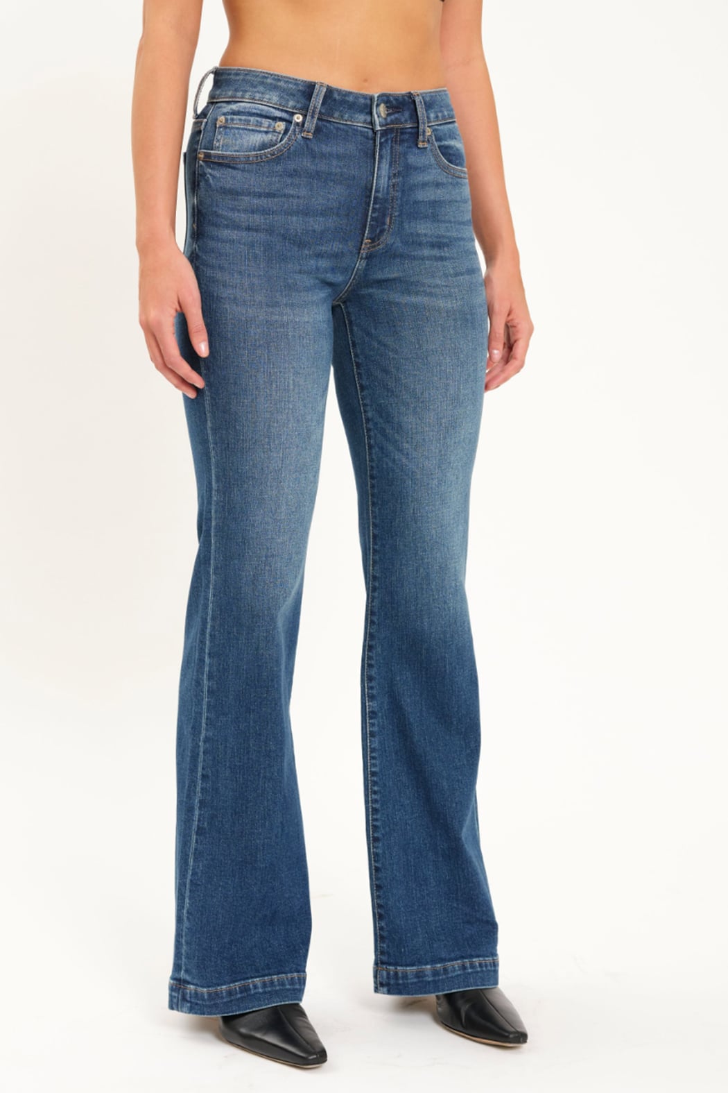 Made from a comfortable denim with just the right combination of stretch and rigidity, this long flare has a flattering mid rise and wider hem detail. Pair with kitten heels for a trendy look or keep it casual with sneakers and a tee.