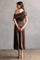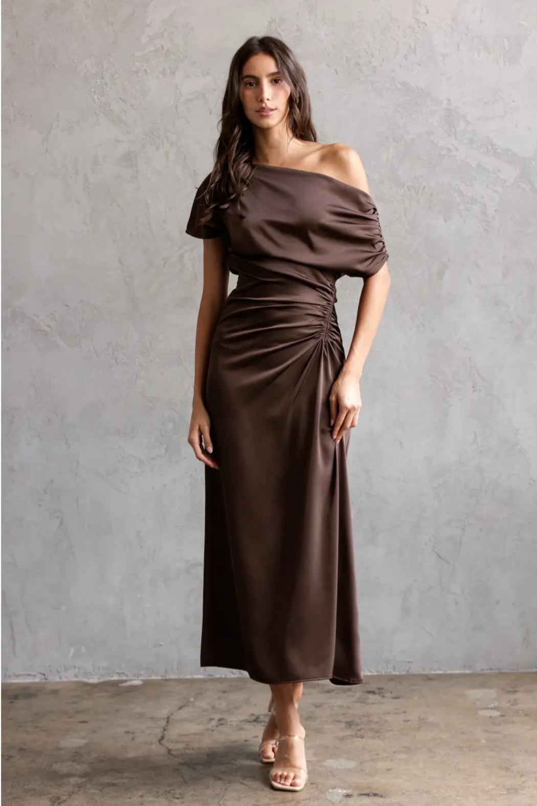 Beautiful chocolate color on smooth fabric with a soft sheen. Column silhouette designed to flatter with a clean elongating shape. One shoulder neckline with gathered short sleeve detail and side ruching cinches the waist for a sculptural look.