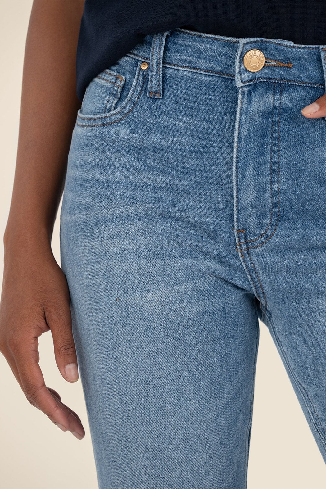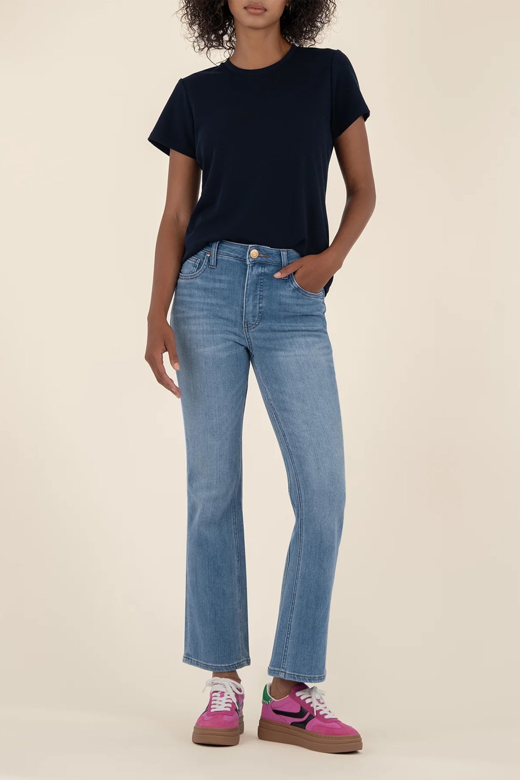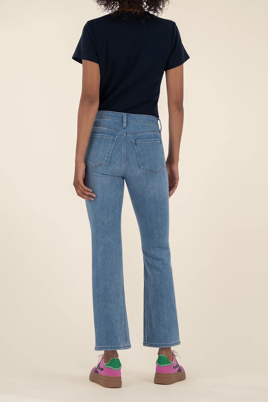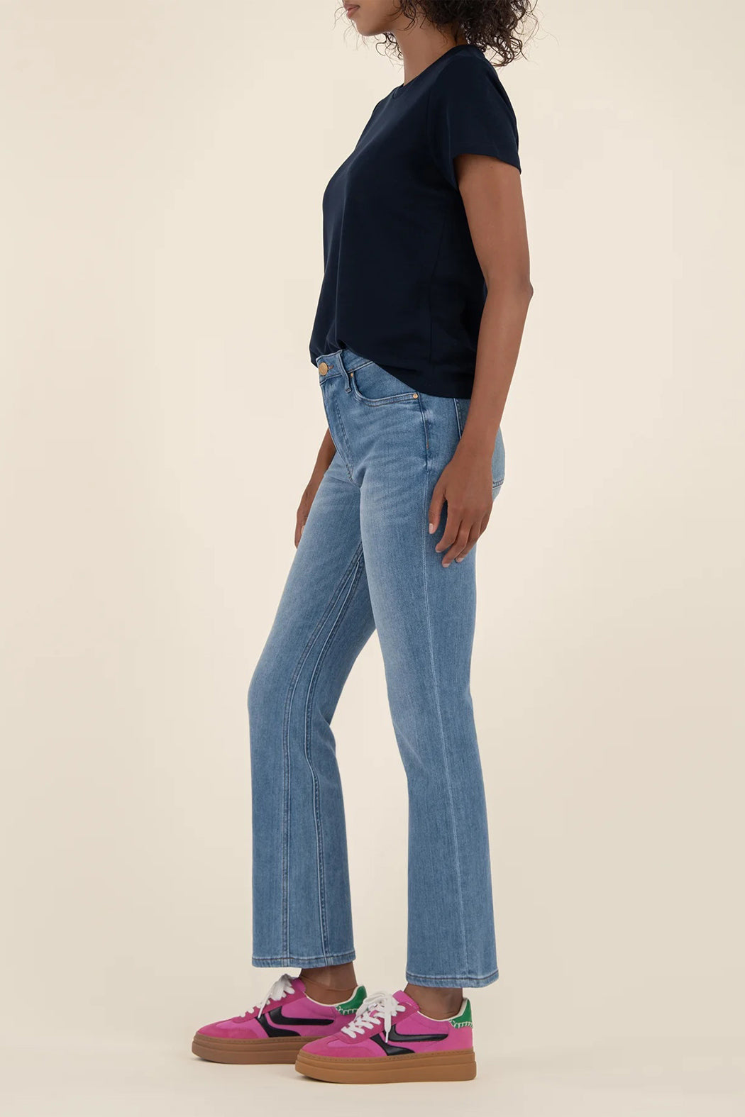 Elevate your denim game with these high-rise ankle flare jeans. Designed with Fab Ab, a classic medium wash, and comfy stretch fabric, these jeans have a fitted leg shape with a subtle flare at the ankle and a triangular insert on the inner leg for added interest.