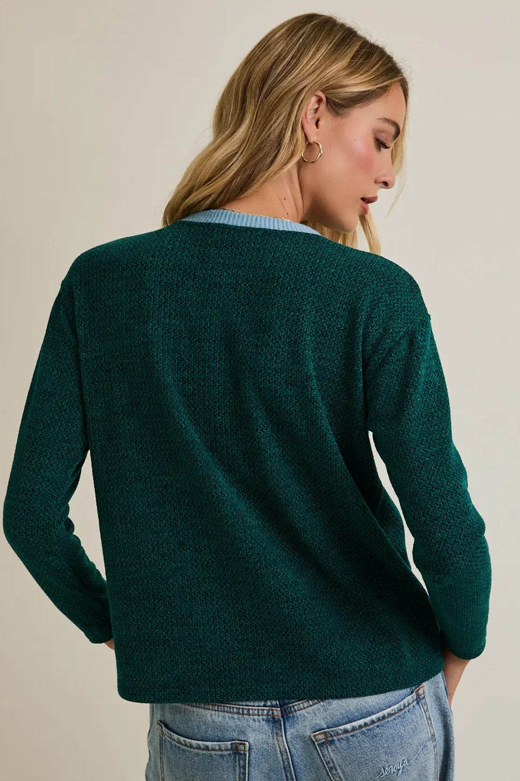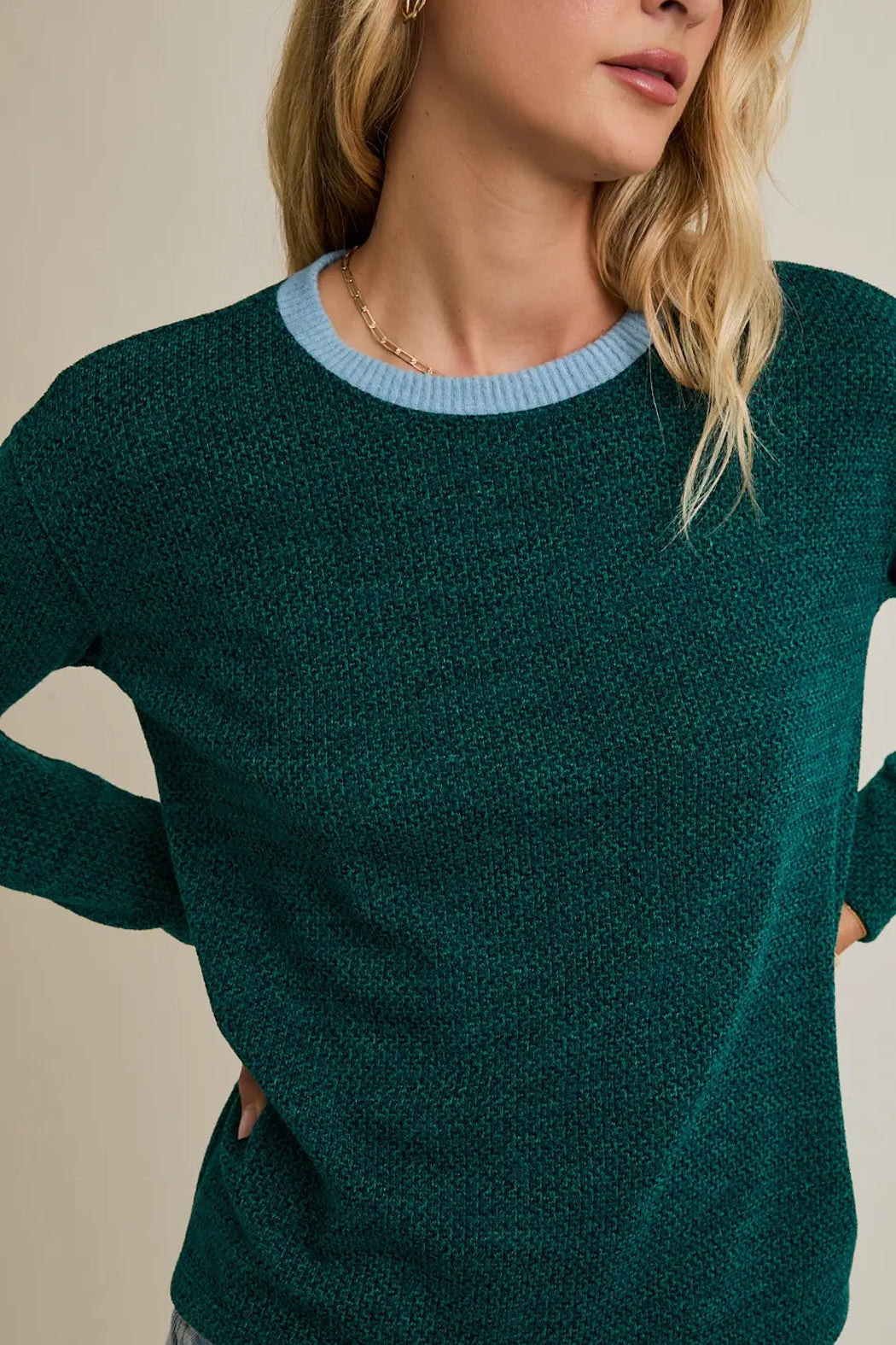 This lightweight buttery soft long sleeve top features a crew neckline in a contrasting blue rib that pairs perfectly with the textured green of the body. Pair this shirt with jeans and boots for a casual night out or keep it chill with leggings or sweats for around the house. Follow @lunaboutiquecanton on instagram and DM us with any questions :)