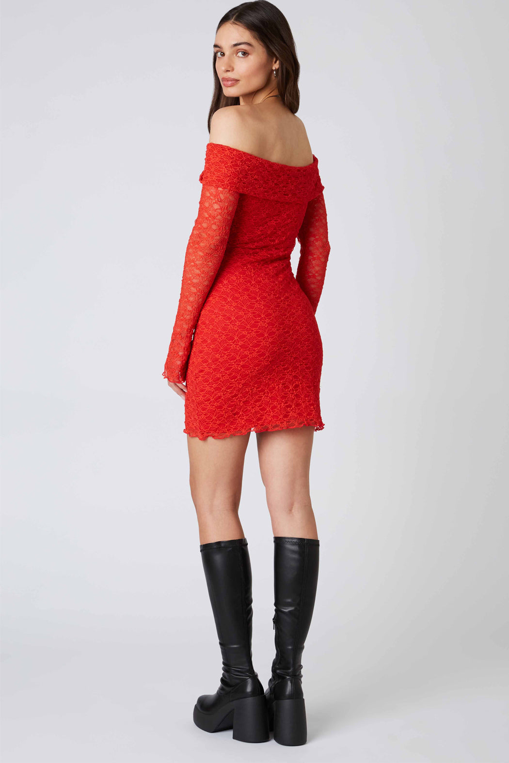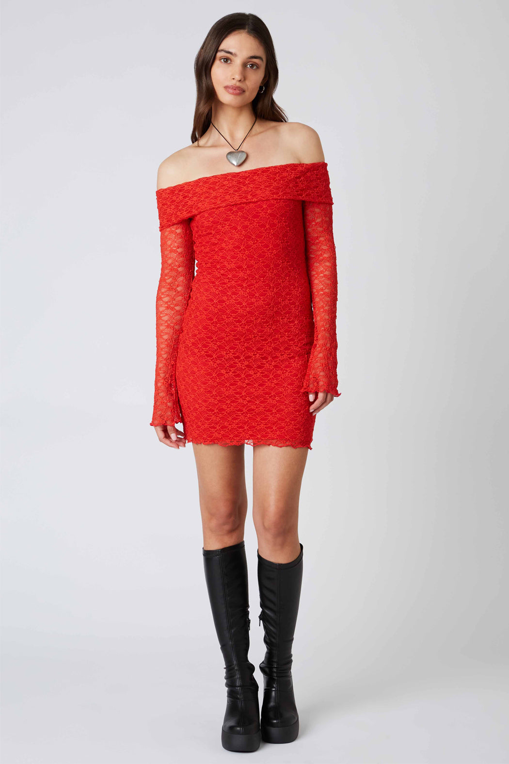 In a bold cherry red, this long sleeve off shoulder mini dress in a bodycon shape is perfect for your next formal, dance, or christmas party. Wear it on its own with heels or dress it down by layering a sweater over it and pairing with boots or sneakers.