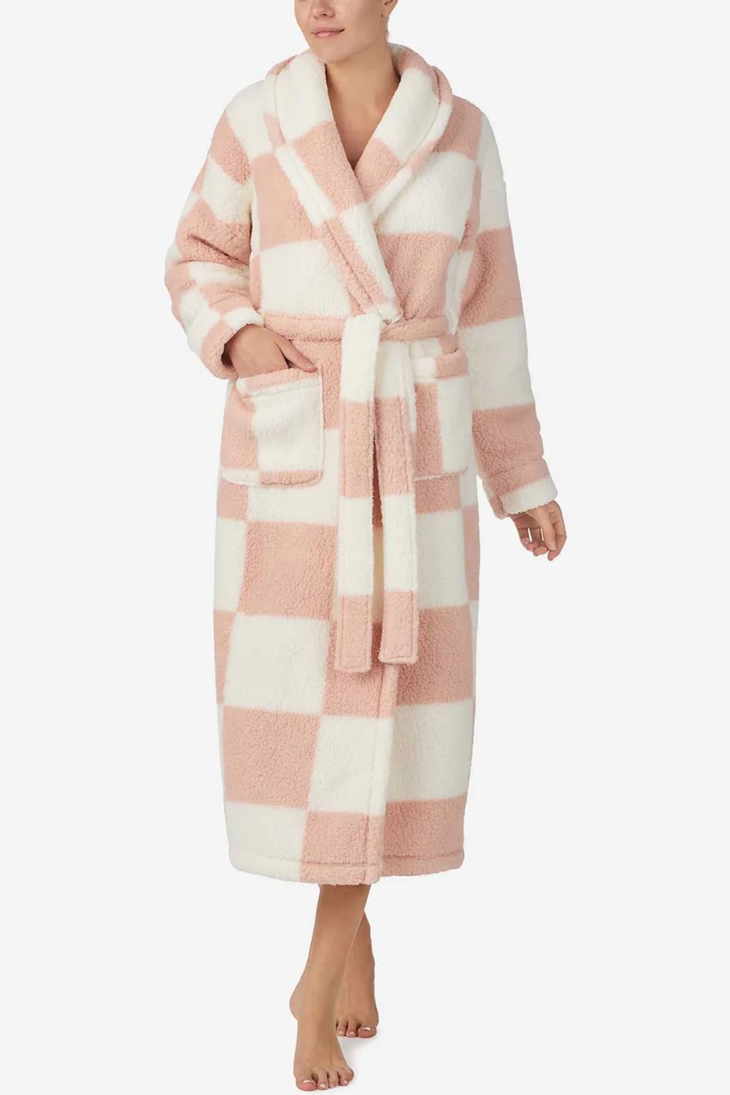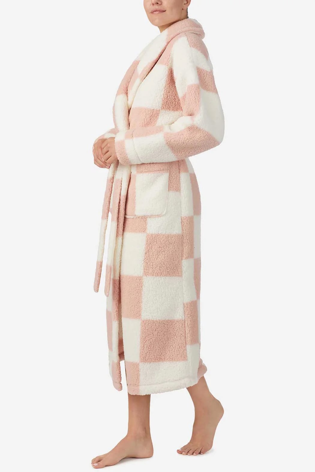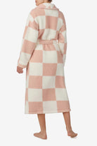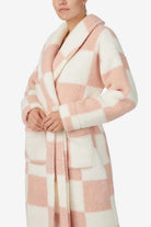 This ultra soft plush robe in a pink and white check pattern features a large shawl collar, belt with loops, and two front pockets.