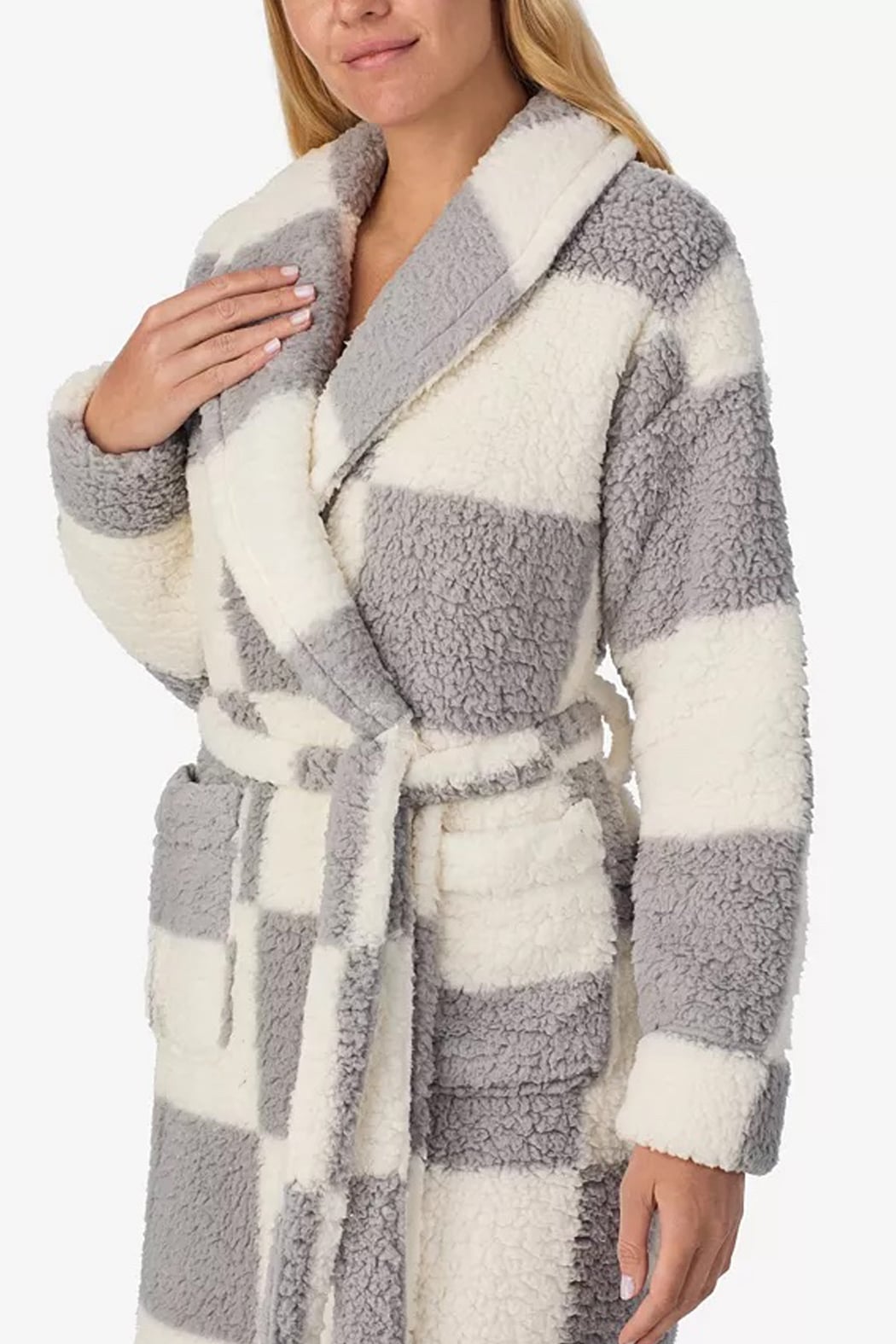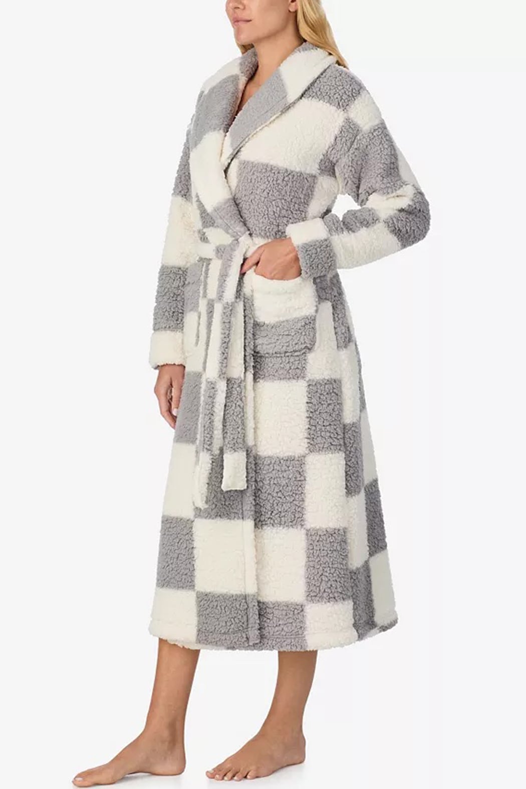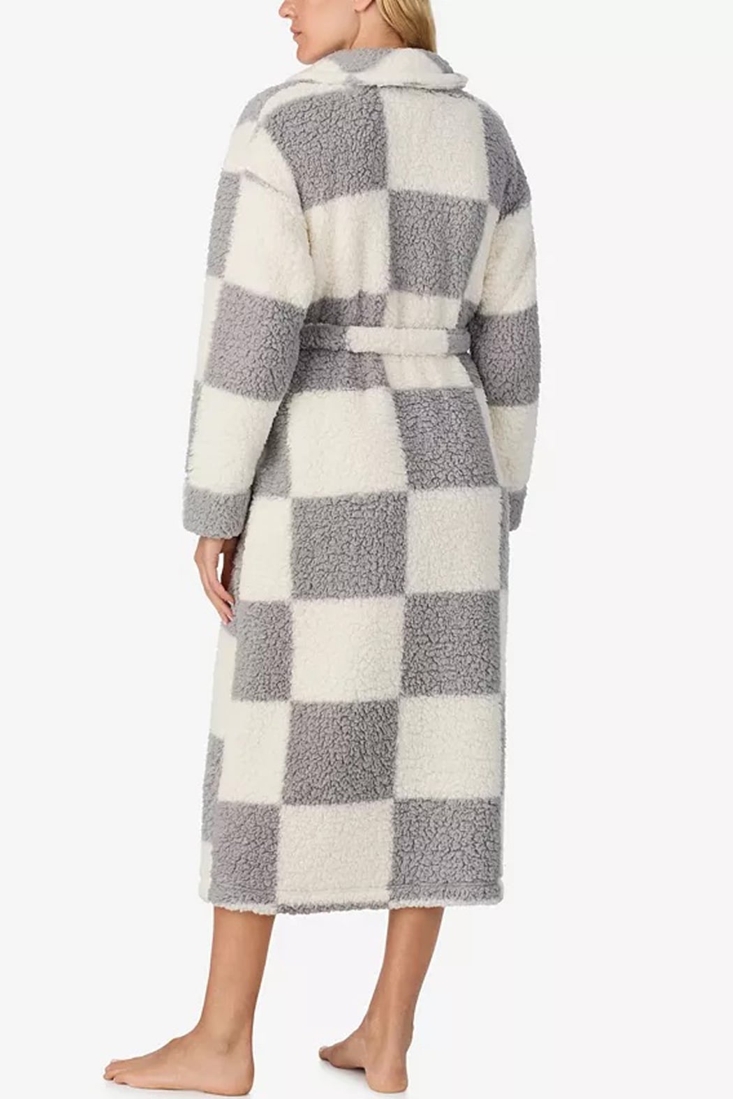 This ultra soft plush robe in a grey and white check pattern features a large shawl collar, belt with loops, and two front pockets. Model is 5'9 wearing a size S. Length: 50" Follow @lunaboutiquecanton on instagram and DM us with any questions :)