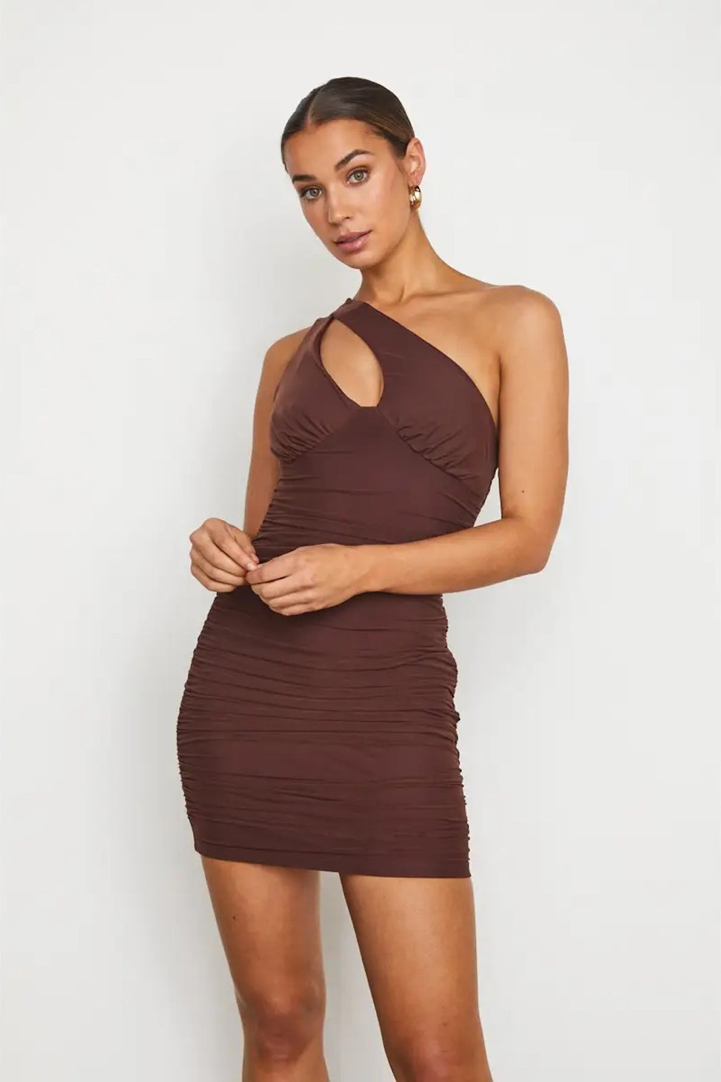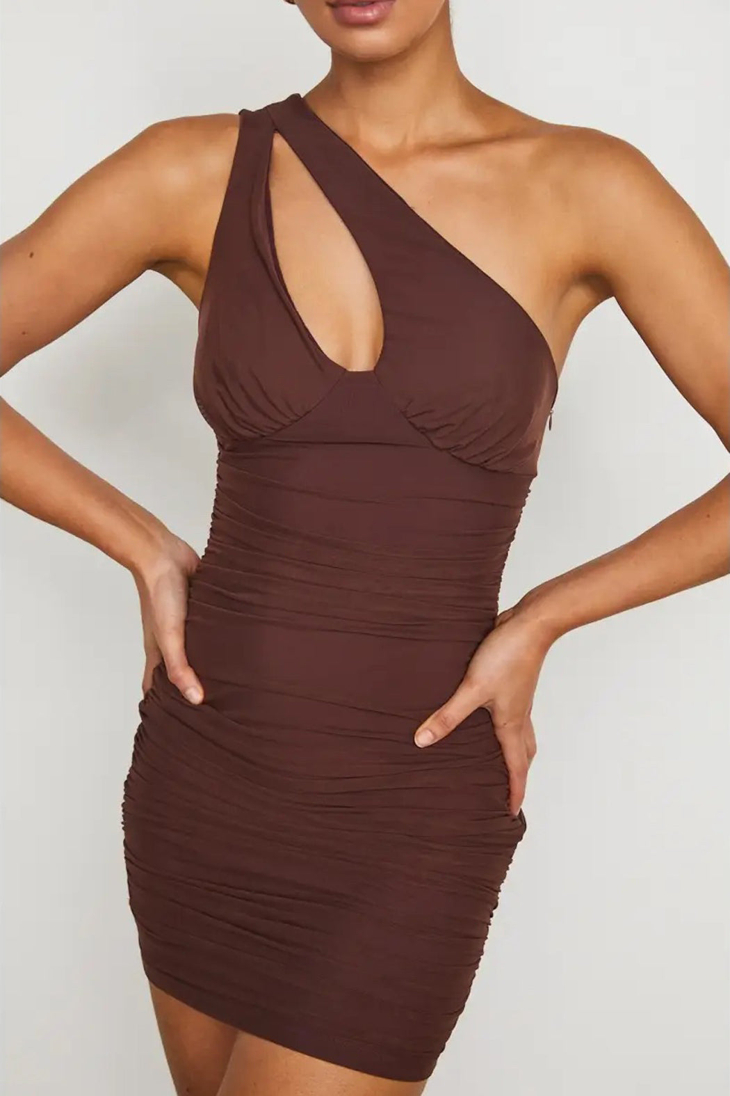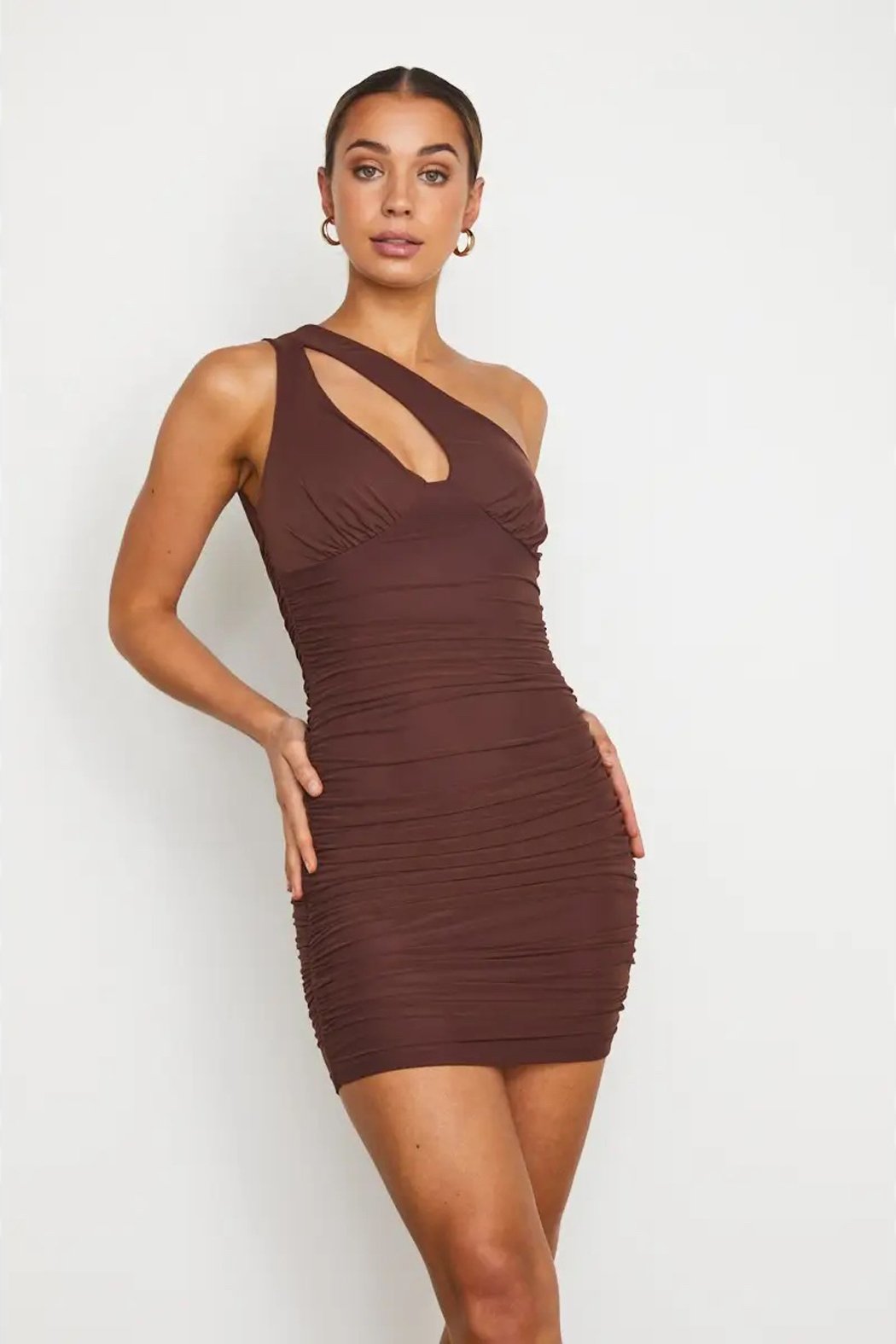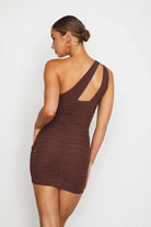 In a rich chocolate brown stretch mesh, this bodycon mini dress features side ruching and a one shoulder strap with a sexy cutout detail.